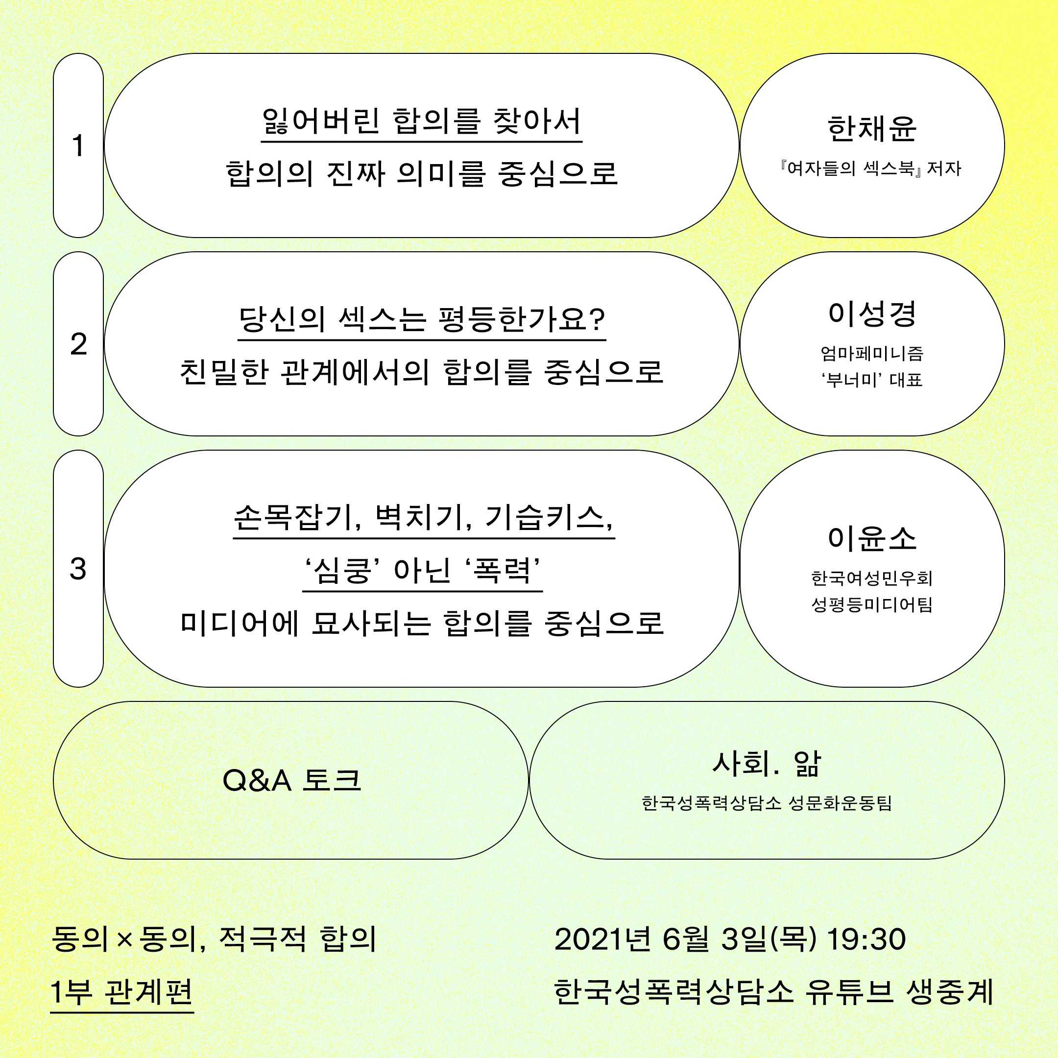 지난 6월 3일, 릴레이 토크쇼 [동의 x 동의, 적극적 합의] 1부 관계편이 온라인 생중계로 진행되었습니다. 이번 릴레이 토크쇼는 ‘적극적 합의’의 세 가지 측면 - 관계, 주체, 실천- 에 대하여 다양한 경험과 영역의 패널들과 함께 이야기 나누며 ‘적극적 합의’에 대한 더 확장된 이해를 도모하기 위해 기획되었습니다. 1부 관계편에서는 성문화운동팀 앎 활동가가 사회를 맡았고, 『여자들의 섹스북』 저자 한채윤 님, 엄마 페미니즘 ‘부너미’ 대표, 『당신의 섹스는 평등한가요?』 기획 및 공저 이성경 님, 한국여성민우회 성평등미디어팀 활동가 이윤소 님이 패널로 출연했습니다. 발제 중심의 딱딱한 발표보다는 즐거운 대화가 오가는 행사를 만들고자 하였는데, 유머와 위트가 넘치는 발표와 토크 덕분에 현장에서는 웃음이 팡팡 터지곤 했습니다. (그러는 바람에 현장의 웃음소리가 방송 음향에 섞여 나가는 아쉬움도 있었지만요;;) 생각의 전환과 확장을 불러 일으켰던 발표 내용을 간단하게 소개드리겠습니다.