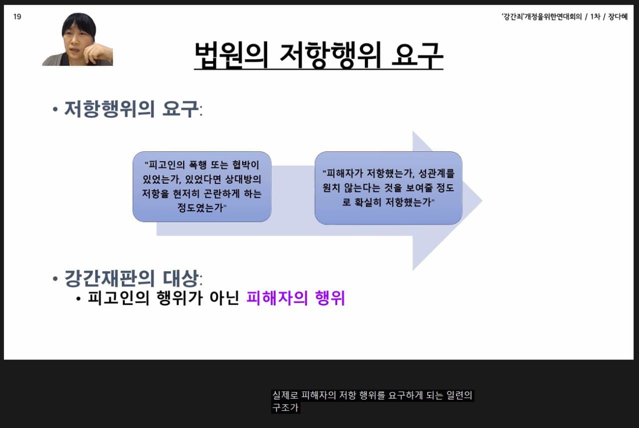 지난 8월 17일(화), 8월 20일(금) 오후 7시 30분 온라인 화상회의(ZOOM)에서 '강간죄'개정을위한연대회의가 주최하는 연속 특강 <강간죄, 우리가 바꾸자, 지금 여기에서!>가 두 차례 진행되었습니다.