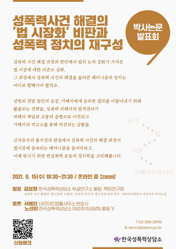 지난 9월 15일 수요일 저녁, 상담소 부설연구소 울림의 책임연구원인 김보화(파이)님의 박사논문 발표회가 진행되었습니다. 발표자가 “성폭력 사건 해결의 ‘법 시장화’ 비판과 성폭력 정치의 재구성”이라는 긴 제목의 논문을 요약해서 발표한 후, 더라이트하우스 법률사무소 서혜진 변호사와 한국성폭력상담소 여성주의상담팀 노선이 활동가의 토론, 그리고 질의응답이 이어졌습니다.