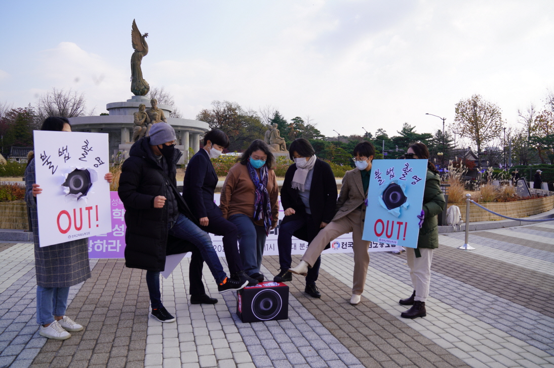 2021년 11월 25일, 여성폭력추방주간 시작일. 전국적으로 수많은 젠더폭력 대응 현장의 활동들이 있었습니다. 이 날 오전 11시, 청와대 앞에서 전국교직원노동조합과 166개 연대단위가 주최한 기자회견 <학교 내 불법촬영과 디지털 성폭력 근절을 위한 범정부 대책마련 촉구 선언 기자회견> “정부는 학교 내 디지털 성폭력 추방하라!” 에 다녀왔습니다.