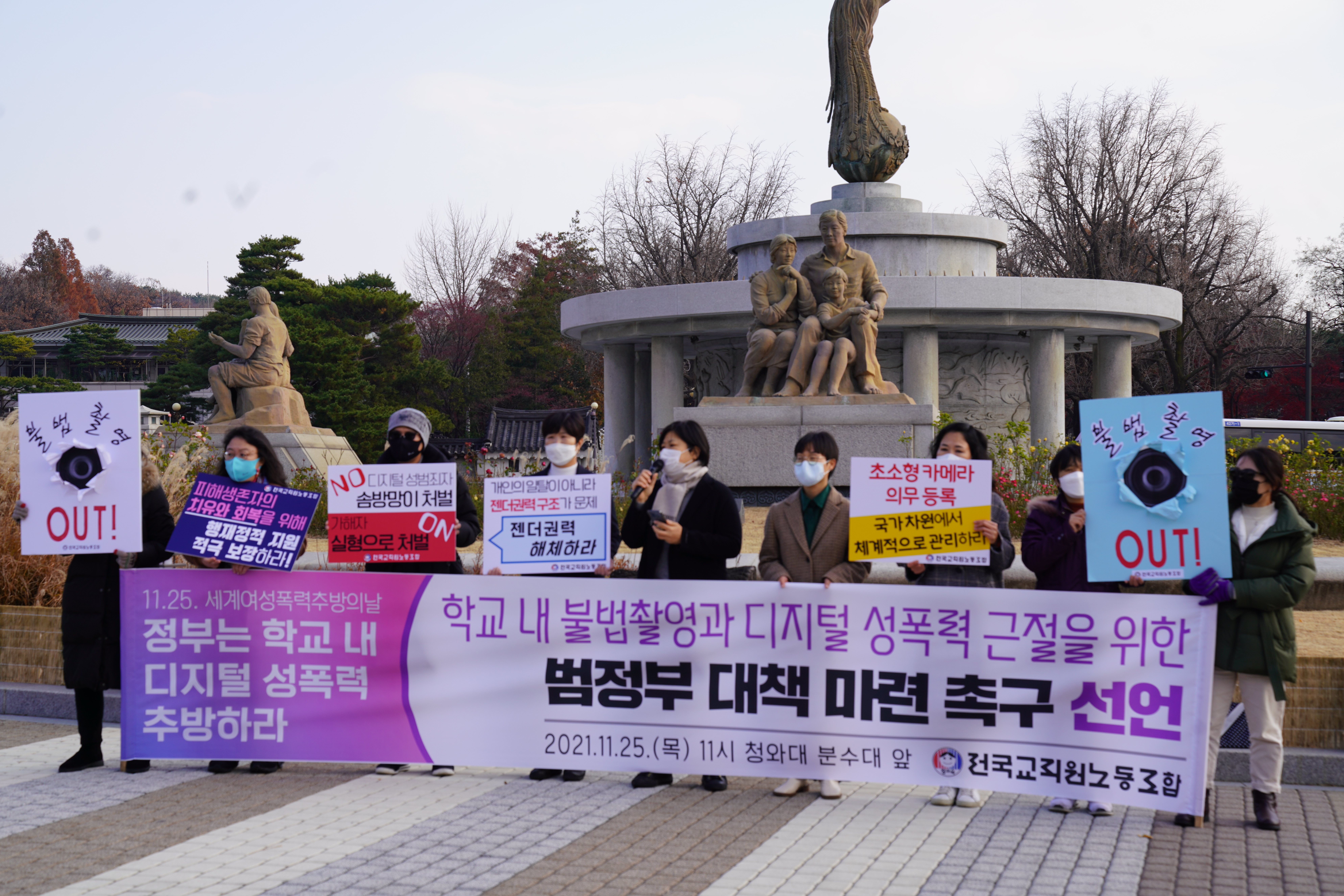 2021년 11월 25일, 여성폭력추방주간 시작일. 전국적으로 수많은 젠더폭력 대응 현장의 활동들이 있었습니다. 이 날 오전 11시, 청와대 앞에서 전국교직원노동조합과 166개 연대단위가 주최한 기자회견 <학교 내 불법촬영과 디지털 성폭력 근절을 위한 범정부 대책마련 촉구 선언 기자회견> “정부는 학교 내 디지털 성폭력 추방하라!” 에 다녀왔습니다.