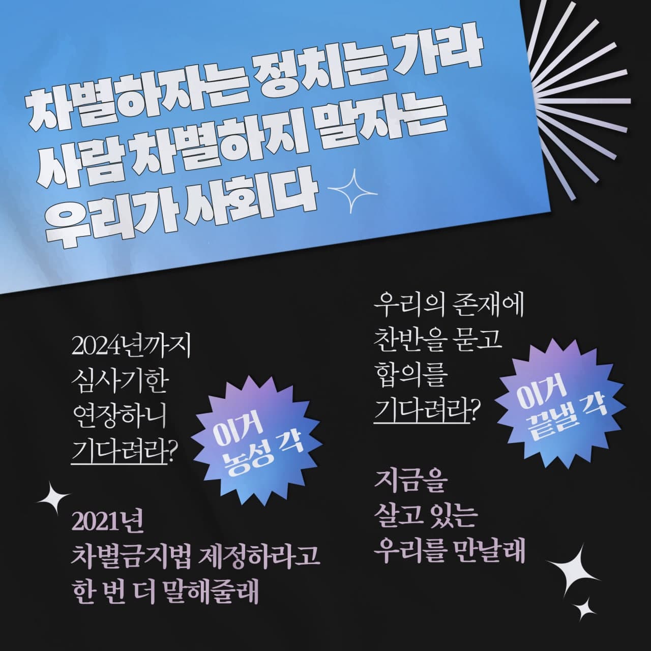 국회의 다수의석을 차지한 더불어민주당과 국민의힘에 묻습니다. 차별금지법에 대한 귀 당의 입장은 무엇입니까. 차별금지법을 한 번도 발의해본 적 없는 국민의힘은 차별금지법을 반대합니까? 헌법이 보장한 평등할 권리를 부정합니까? 21대 국회에서 3개의 대표발의 법안을 낸 더불어민주당에 묻습니다. 차별금지법이 부끄러워서 대통령 후보만 되면 숨깁니까. 성소수자혐오를 대가로 표를 구걸하는 게 부끄러운 줄을 모릅니까. 국회에 묻습니다. 사회적 합의가 필요하다는 말을 반복하는 동안 당신들은 사회적 합의를 이루기 위해 무엇을 했습니까.