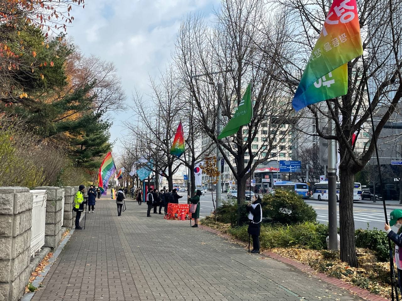11월 25일 국회 본회의가 열리는 날이었습니다. 많은 의원들이 본청에 모이는 날, 기자회견 “차별금지법 14년의 유예, 더불어민주당이 책임져라”와 동시에 국회 담장을 깃발로 둘러싸는 액션을 진행했습니다.