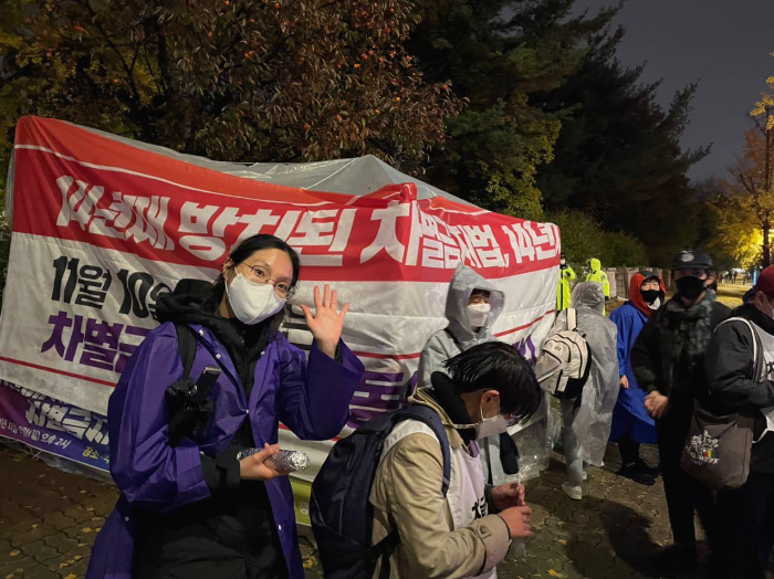 국회 연내 제정을 촉구하며 차별금지법제정연대의 미류, 종걸 두 활동가는 10월 12일 부산에서 출발해 전국 행진을 시작했고 11월 10일 서울에 도착했습니다. 함께 국회를 향해 행진하기 위해 상담소의 활동가들은 금천구청역에 도착했습니다. 11월 10일은 국회 법제사법위원회가 미뤘던 차별금지법제정에 대한 국민동의청원 심사 기한일이기도 했습니다. 2021년 6월, 10만명의 동의로 차별금지법 제정에 대한 청원이 달성되었고 그 다음 절차로 법제사법위원회의 심사가 예정되어 있었습니다. 국회의 긍정적이고 적극적인 답변을 기다리고 있던 상황이었습니다. 그런데 금천구청역에 도착해서 깃발을 펴고 활동가들을 기다리던 중 들은 소식은 국회가 청원 심사를 2024년 5월 29일까지 미룬다는 것이었습니다. 2024년, 생각지도 못한 년도가 등장했습니다.