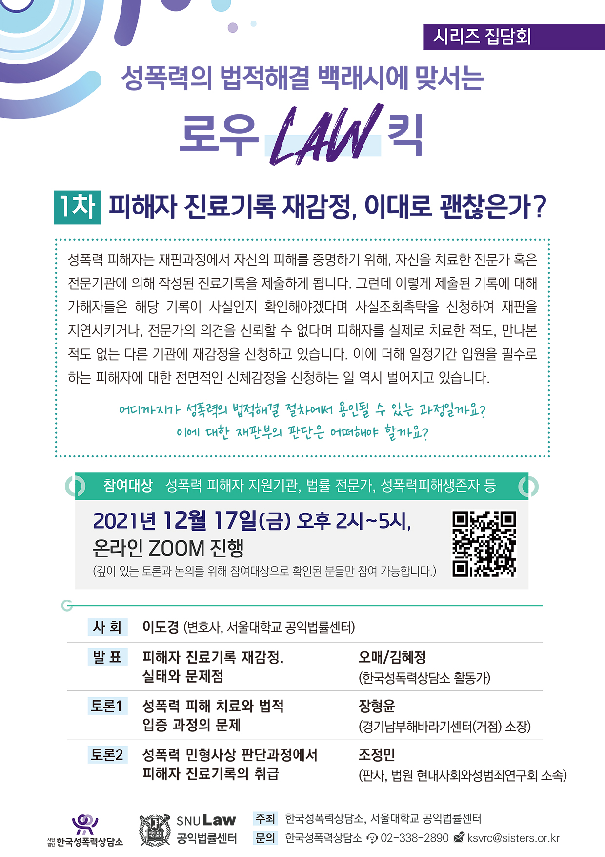 한국성폭력상담소와 서울대학교 공익법률센터가 공동주최하는 시리즈 집담회 성폭력의 법적해결 백래시에 맞서는 로우(Law) 킥은 피해자들의 용기 있는 말하기와 시민들의 연대로 이뤄진 성폭력특별법의 제정, 관련 법제목의 변화, 수사재판과정에서의 피해자 권리보장제도의 확대, 판례를 바꾸는 법인식의 변화에 나타나는 반발, 반격을 뛰어넘기 위해 기획되었습니다.