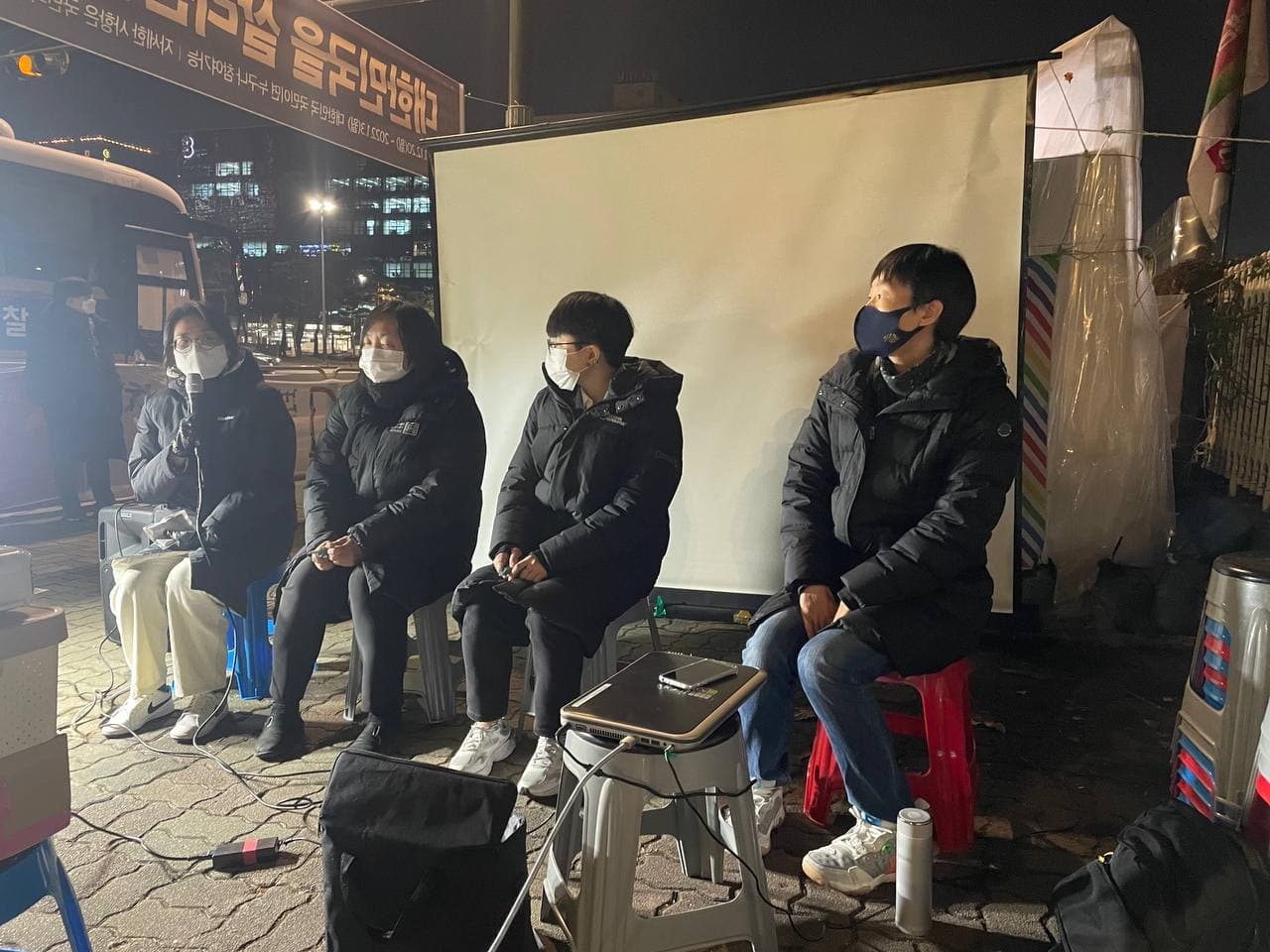 저녁 7시부터는 경계를 맞잡는 인권영화제 ‘평등수크린’이 농성장 앞에서 진행되었습니다. <살인자, 그리고 살인자들> 영화 관람 후 이야기 나누는 시간을 가졌습니다. 여성에 대한 폭력과 차별을 종식시키기는 일은 자유를 확장하는 일이어야 하며 차별금지법, 비동의 강간죄 개정, 스토킹처벌법, N번방방지법이 있어야 하는 이유라는 이야기를 나누었습니다.