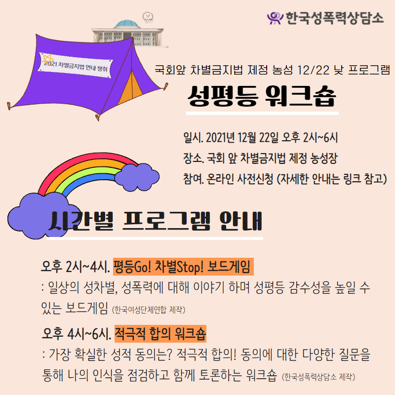 11월 8일 국회앞 차별금지법 연내 제정을 쟁취하기 위한 농성장이 꾸려졌습니다. 농성장에서는 차별금지법 제정을 국회에 요구하며 매일 다양한 프로그램이 이어지고 있는데요, 12월 22일 45일차 오전 10시부터 46일차 오전 10시까지 한국성폭력상담소가 농성장을 지켰습니다.