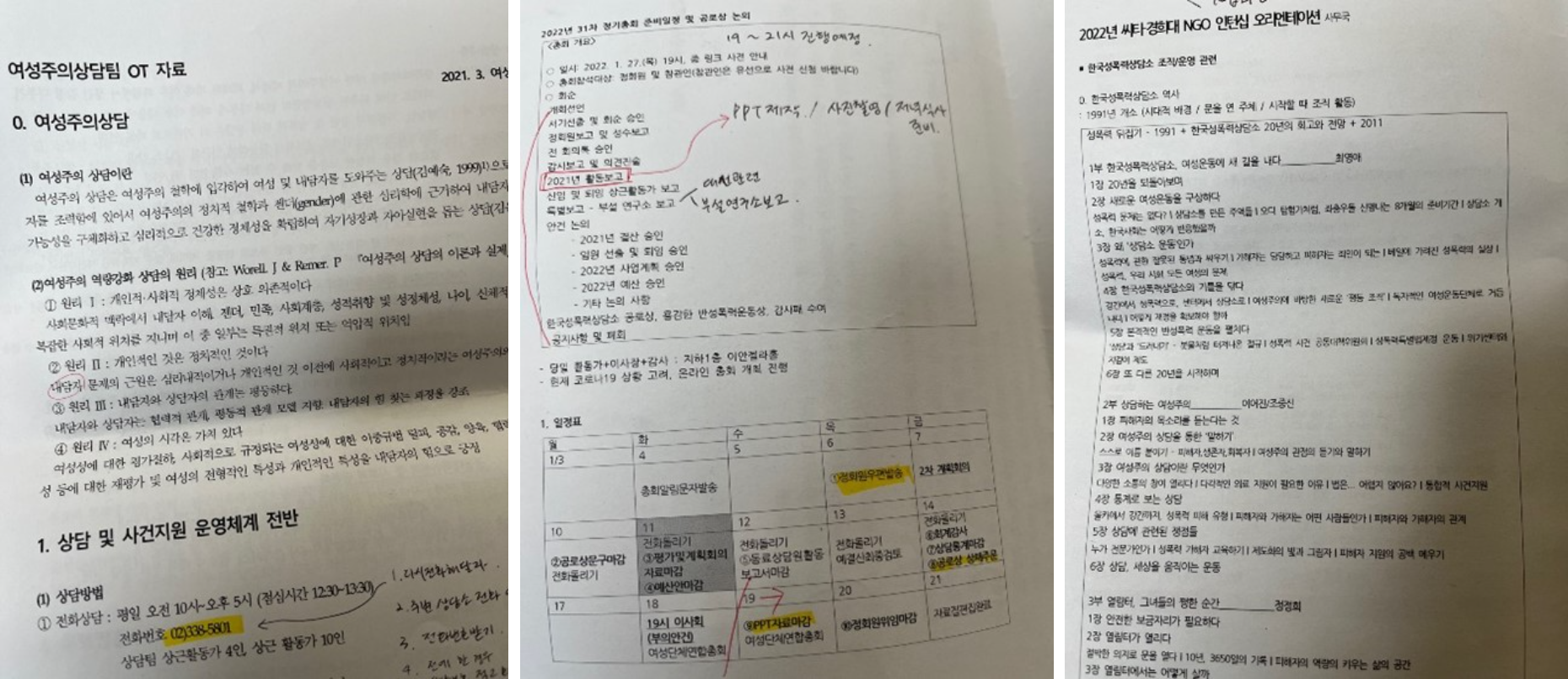 매일 아침 10시에 이루어진 ‘아침나눔’ 시간을 통해서는 나도 상담소의 일원이구나 하는 소속감을 느낄 수 있었고, 다양한 여성 운동, 회의, 캠페인의 내용을 전해들을 수 있었습니다. 처음에는 ‘모낙폐’, ‘한사성’, ‘전성협’ 등의 줄임말을 이해하지 못해 당황하기도 했지만, 아침나눔을 거듭하며 이러한 용어들이 들리는! 신기한 경험을 했습니다. 또한 상담소의 언어를 배울 수 있어 좋았습니다. ‘여성주의상담’을 진행하고 있는 상담소는, 상담소 내부에서도 상담소 만의 섬세한 언어를 사용합니다. 지금껏 무의식적으로 사용하던 용어들이 누군가에게는 혐오의 표현으로 들릴 수 있음을 알았습니다.