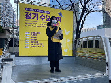 그러나 칼바람에 설치해둔 카메라가 떨어지고, 장갑을 낀 손가락 마디마디가 에일 것 같이 추운 날씨에도 많은 분들이 수요시위에 함께 해 주셨습니다. 그러나 현장을 가득 채워 주신 많은 분들의 얼굴과 언론사에서 취재까지 온 모습을 보니 ‘내가 사회를 잘 볼 수 있을까?’ 걱정도 되고 정말 너무 떨렸던 것 같습니다. 그런 제 모습이 너무 잘 보였는지 긴장한 모습을 보일 때마다 옆에서 닻별 님과 다른 활동가분들이 잘 할 수 있다 용기를 불어넣어 주셔서 시작 직전에는 떨지 않고 침착하게 최종 준비를 할 수 있었습니다. 막상 수요시위가 시작되고, 무대에 올라서고부터는 하나도 긴장되지 않았습니다. 그저 이 순간을 함께 하고 있다는 것이 벅차고 행복했습니다. 모든 순간순간들이 기억나지만 그 중에서도 가장 특별했던 순간은 전쟁과여성인권박물관 sns 대학생 기자단으로 활동하고 계시는 시온님의 연대발언이었습니다. 무대 아래에서 시온님의 연대발언을 듣는데 눈물이 나 참을 수가 없었습니다. ‘울면 안 돼, 너 올라가서 사회 봐야돼. 제발 참아.’ 몇 번이나 마음 속으로 되뇌었는지 모르겠습니다. 그러나 무대 위에 올라 정의연 활동가분들이 시온님을 꽉 안아주는 모습을 보는 순간, 제 다짐은 무너져 내리고 말았습니다. 무대에서 절대 울지 않겠다 다짐했었는데. 그러나 다행히 살을 어는 듯한 추위가 제 눈물을 멈추는 것을 도와, 연대발언 순서를 잘 마무리할 수 있었습니다.