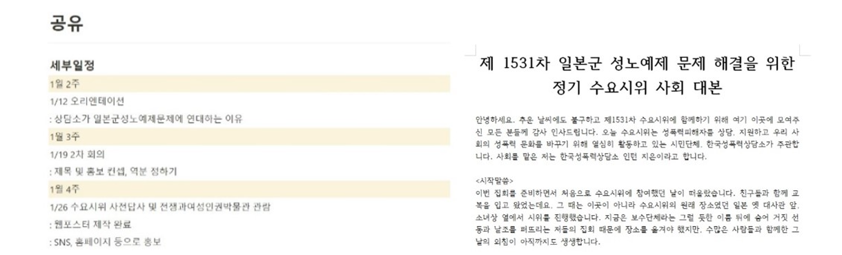 인턴으로서 맡은 또 다른 중요한 업무는 제 1531차 일본군 성노예제 문제해결을 위한 정기 수요시위를 주관한 것이었습니다. 이번 수요시위의 제목은 ‘우리는 듣고있는가?’로, 성폭력 생존자들의 ‘말하기’에 귀 기울여야 함을 강조한 제목입니다. 저는 수요시위의 포스터와 카드뉴스, 피켓을 제작하였습니다. 포스터와 카드뉴스에는 모든 피해자분들이 정신적 고통에서 벗어나 자유롭게 날갯짓하길 염원하며 나비와 소녀상, 그리고 노란색을 활용하였습니다. 피켓에는 저희의 구호인 “피해자다움은 없다. 우리의 이야기는 계속된다”와 “세상은 변화했다, 우리가 상식이다” 를 나비와 함께 크게 적었습니다. 또한 저는 아주 중요한 역할인 사회를 맡았는데요, 수요시위 직전까지 정말 정말 너무 걱정되고 떨렸습니다. 떨리는 마음을 조금이라도 진정시키고자 이런것까지 적어? 할 정도로 자세하게 대본을 작성했습니다. 초안 원고는 부족한 점이 많았지만 닻별님과 하윤님의 피드백을 바탕으로 대본을 보완할 수 있었습니다.
