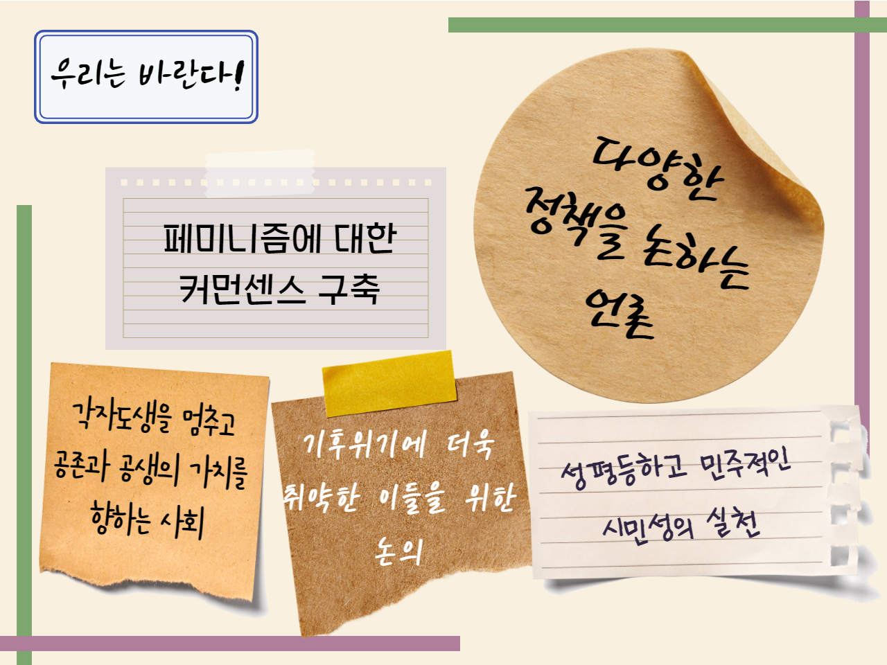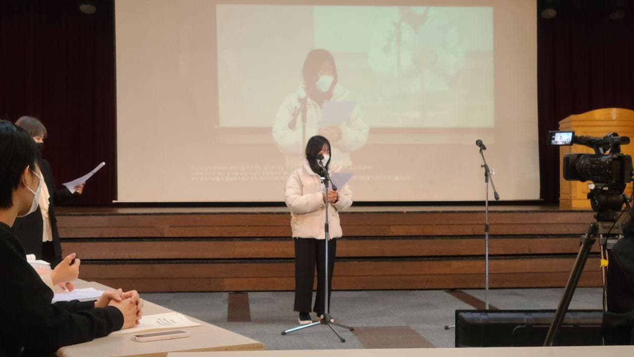 역시 온라인으로 진행된 마지막 발언은, 페미니스트 대학생 송소영님이 대한민국 정치에 던진 요구였습니다. 소영님은 인터넷 문화에서 형성된 차별적 담론이 정치권에 퍼지고 이제는 상식으로 여겨지는 현실에 분노했습니다. 정치권이 여성과 소수자의 목소리에 귀를 기울이지 않는 것을 넘어 그것을 지우고 있다고 느낀다고 했습니다. 그 예로, 한참동안 온라인상에서 반페미니즘의 승리로 기록된 대학교 총여학생회 폐지가 사실은 궐위 상태인 총여학생회에 공백을 느낀 학생들이 자생적 운영과 대안기구 등을 논의하며 도달한 것이었으나, 정치권이 이를 입맛대로 여성가족부 폐지의 근거로 동원하려 했던 것을 들었습니다. 필요 없는 목소리는 지워버리고, 필요한 목소리만 꾸며내는 정치. 그는 그것에 이렇게 요구했습니다. “더 이상 우리의 존재를 지우려고 하지 마십시오. 우리는 침묵하지 않을 것입니다. 우리의 목소리를 왜곡하려고 하지 마십시오. 우리가 외치는 것은 차별 없는 평등한 세상입니다. 우리의 목소리에 응답하십시오. 우리도 동등한 주권자입니다.”