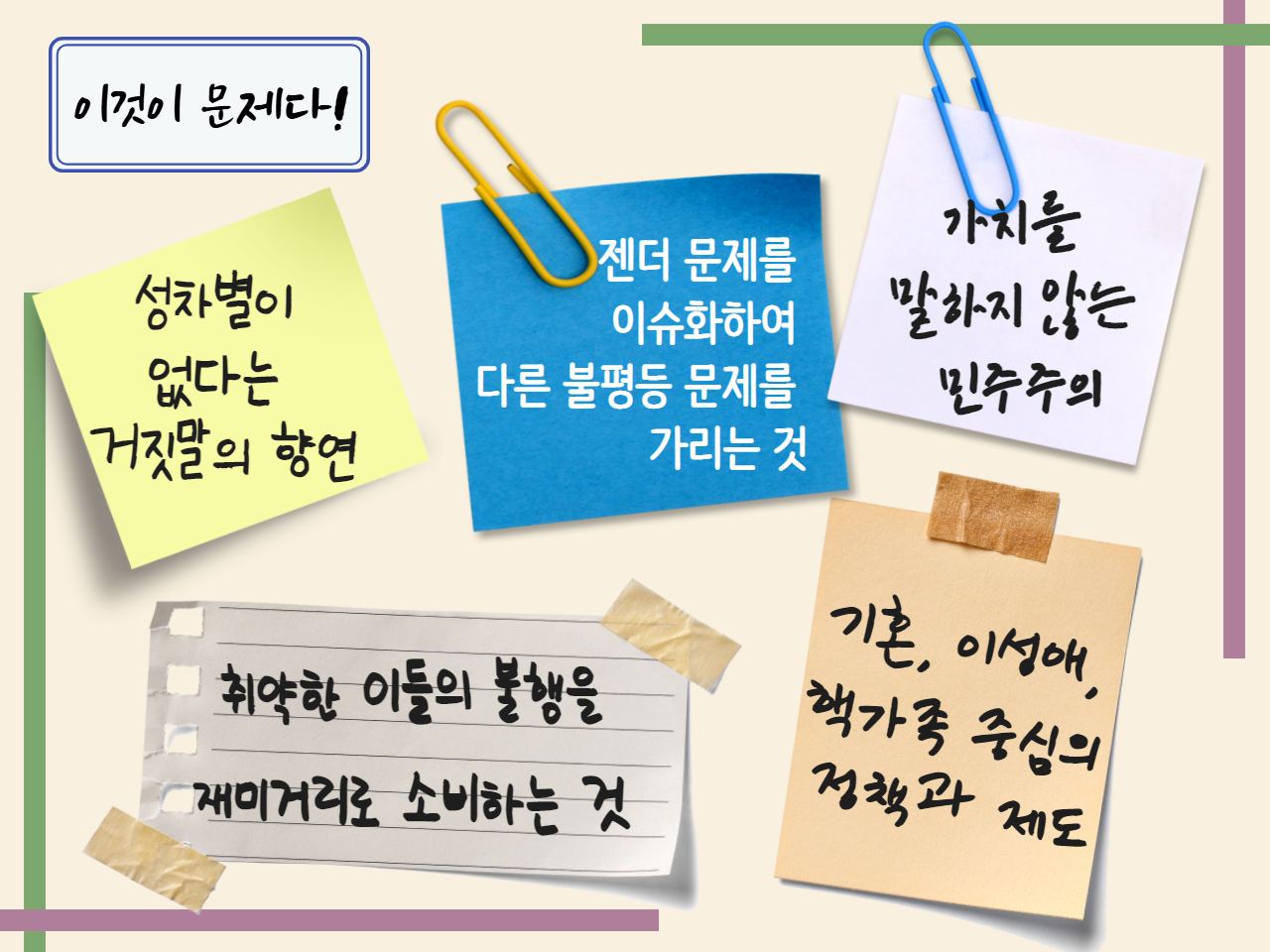 역시 온라인으로 진행된 마지막 발언은, 페미니스트 대학생 송소영님이 대한민국 정치에 던진 요구였습니다. 소영님은 인터넷 문화에서 형성된 차별적 담론이 정치권에 퍼지고 이제는 상식으로 여겨지는 현실에 분노했습니다. 정치권이 여성과 소수자의 목소리에 귀를 기울이지 않는 것을 넘어 그것을 지우고 있다고 느낀다고 했습니다. 그 예로, 한참동안 온라인상에서 반페미니즘의 승리로 기록된 대학교 총여학생회 폐지가 사실은 궐위 상태인 총여학생회에 공백을 느낀 학생들이 자생적 운영과 대안기구 등을 논의하며 도달한 것이었으나, 정치권이 이를 입맛대로 여성가족부 폐지의 근거로 동원하려 했던 것을 들었습니다. 필요 없는 목소리는 지워버리고, 필요한 목소리만 꾸며내는 정치. 그는 그것에 이렇게 요구했습니다. “더 이상 우리의 존재를 지우려고 하지 마십시오. 우리는 침묵하지 않을 것입니다. 우리의 목소리를 왜곡하려고 하지 마십시오. 우리가 외치는 것은 차별 없는 평등한 세상입니다. 우리의 목소리에 응답하십시오. 우리도 동등한 주권자입니다.”
