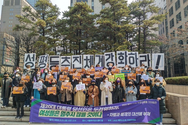 윤석열 당선자는 더 이상 여성을 무시하지 마십시오. 여성의 현실을 외면하지 마십시오. 각성한 여성들은 더 이상 참지 않을 것입니다. 두 눈을 부릅뜨고 지켜볼 것입니다. 우리 여성들은 여기 이렇게 굳건히 존재합니다.