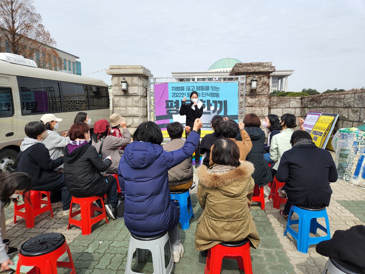 2022인 릴레이 단식행동 '평등한끼'가 3월 14일 시작되었습니다. 단식행동의 일환으로 국회 앞에서 월~금 오전 11시부터 오후 1시까지 집회가 진행되고 있는데요, 3월 17일(목) 한국성폭력상담소와 한국여성의전화 주관으로 <평등 없는 국회에 한 끼 대신 한 마디!> 집회를 열었습니다. 대선을 지나며 '성평등'이 얼마나 시급한 과제인지 확인하였기 때문에, 새로운 정부 출범 전에 완수해야 할 행동 과제로 차별금지법 제정을 할 수 있도록 해야 합니다. 이러한 문제의식을 갖고 성평등 외면하는 국회에, 차별금지법 안 만드는 국회에, 내 삶을 외면하는 정치에 한 마디 하자는 것이 이번 집회의 취지였습니다.