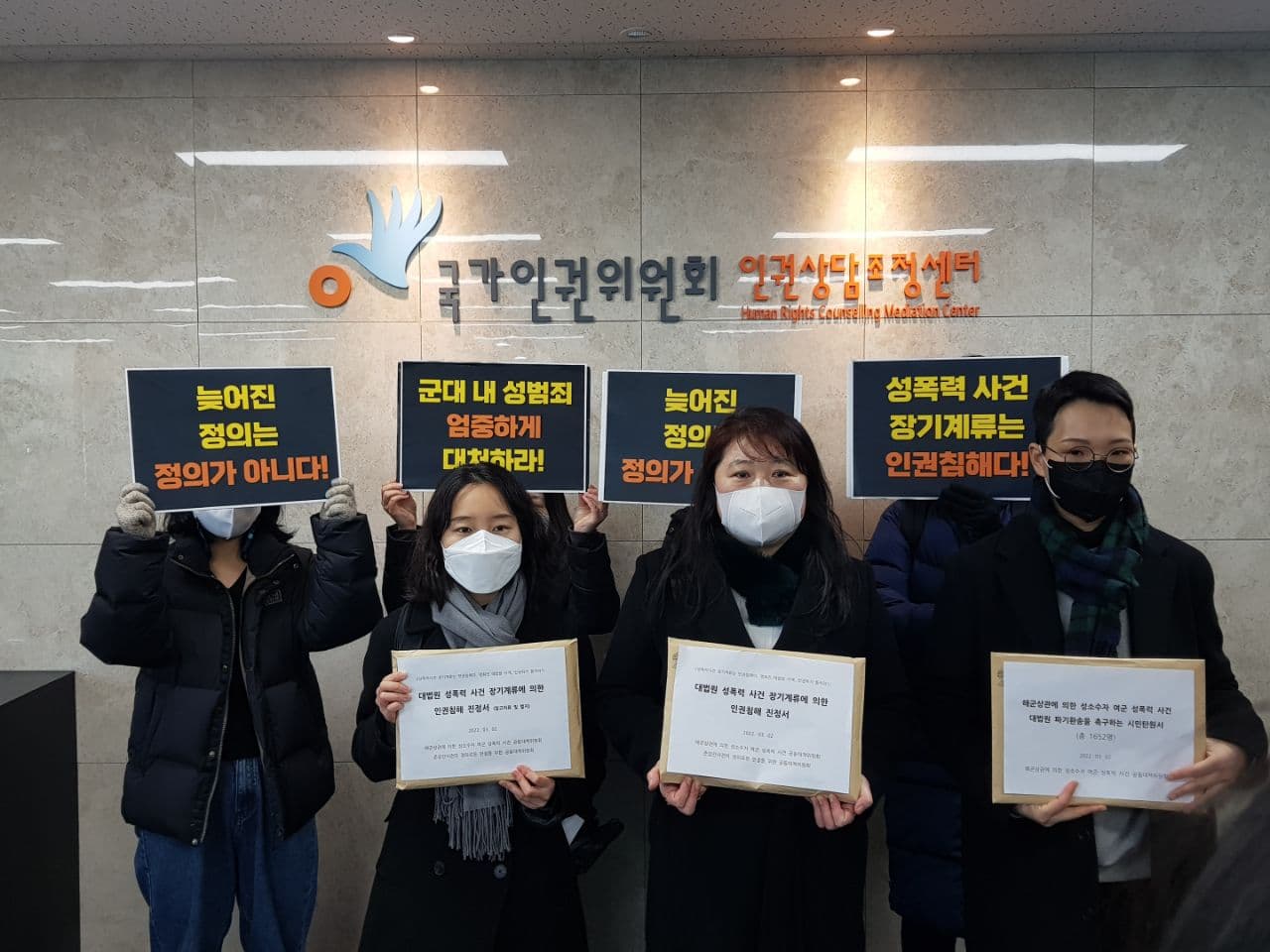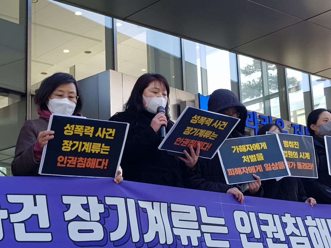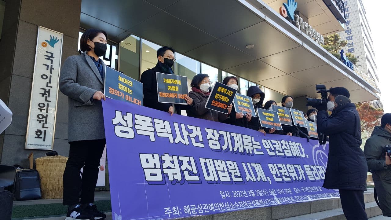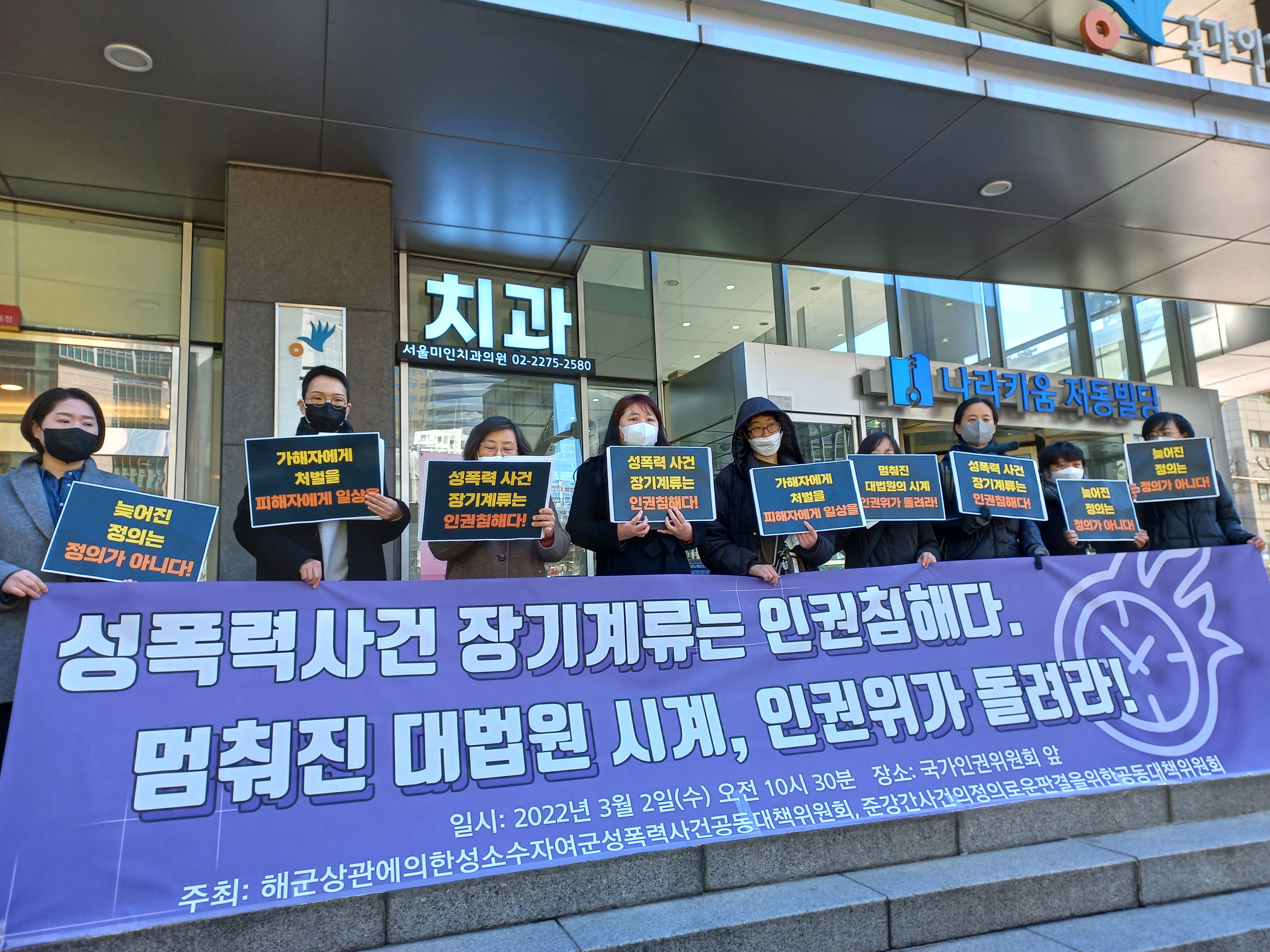 이에 지난 3월 2일(수) 오전 10시 30분 국가인권위원회 앞, 대법원의 성폭력 사건 장기계류가 성폭력 피해자의 인권을 침해하고 있다는 취지로 국가인권위원회에 대법원과 법원을 상대로 진정을 제기하는 기자회견을 개최했습니다.