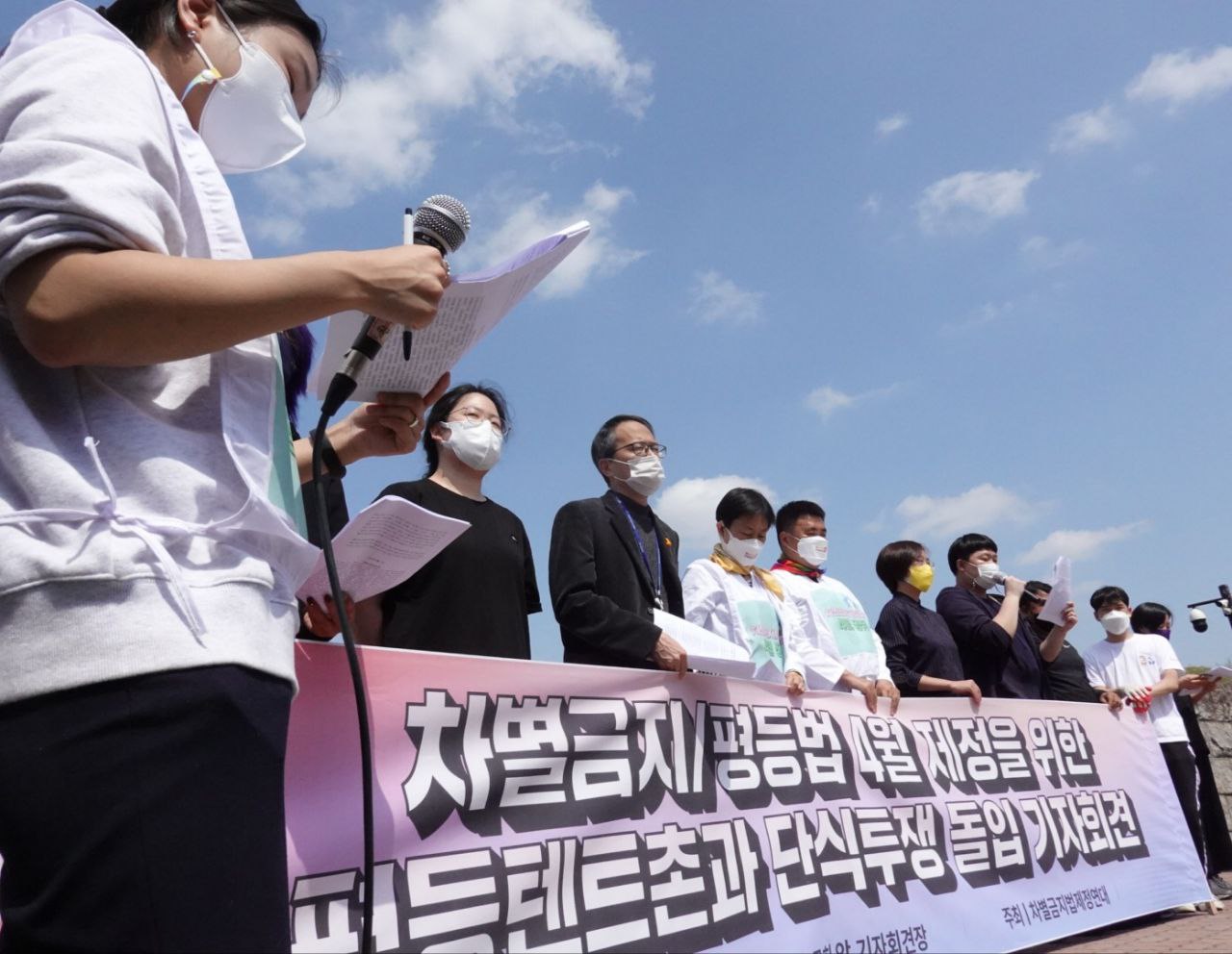 4월 11일 월요일 오전 국회 2문 앞에서는 다양한 시민사회단체, 인권활동가들이 모였습니다. 차별금지법이 15년째 제정되지 못하고 있는 상황에서 4월 국회에서는 반드시 입법이 되어야 한다는 메시지를 국회에 전달하기 위해 평등텐트촌과 단식투쟁이 시작되었기 때문입니다.