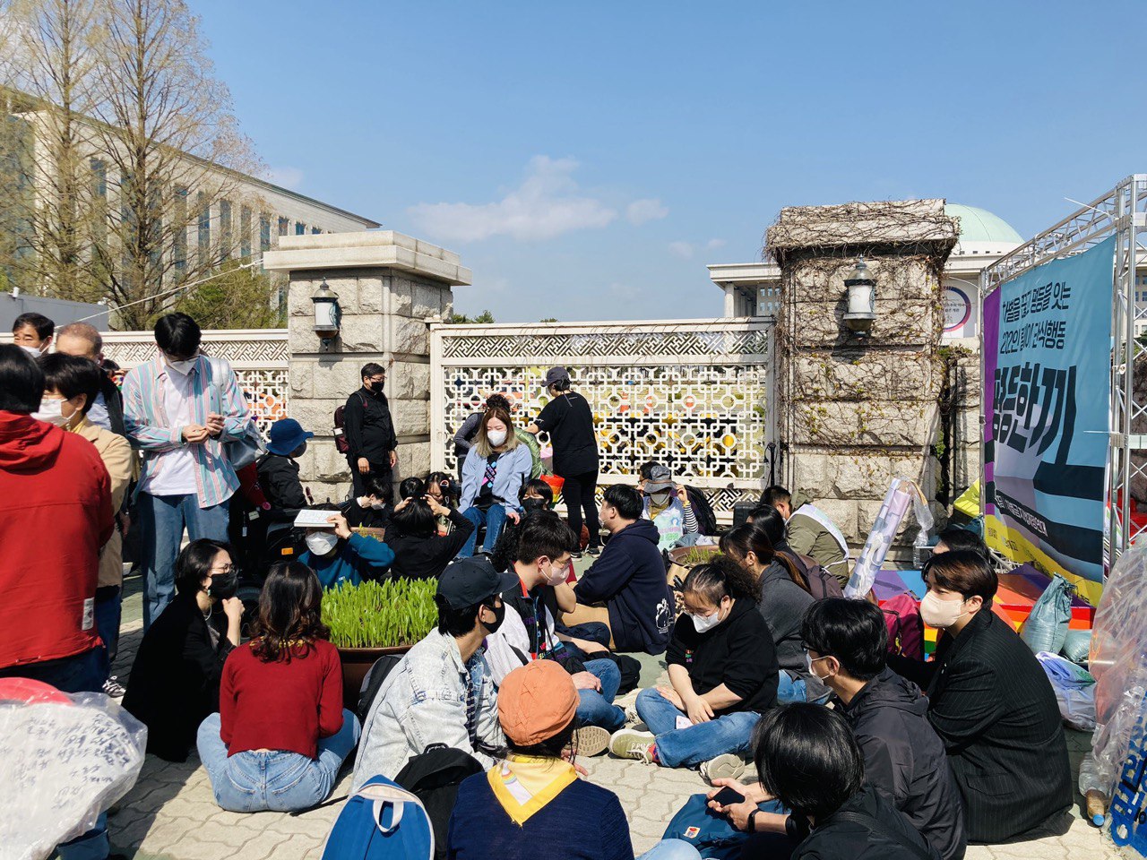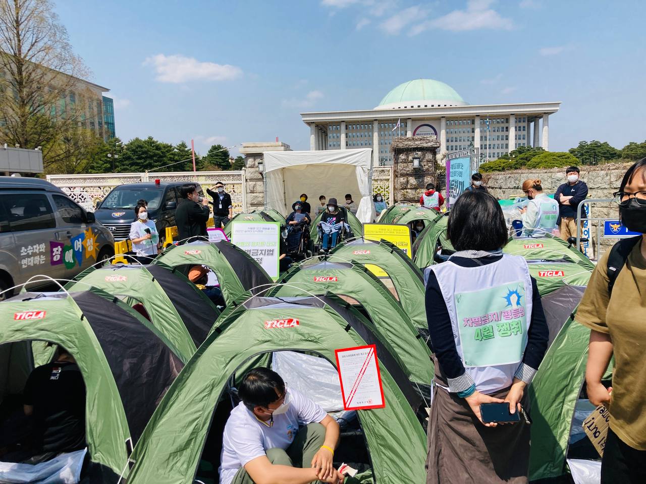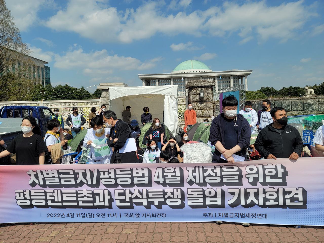 4월 11일 월요일 오전 국회 2문 앞에서는 다양한 시민사회단체, 인권활동가들이 모였습니다. 차별금지법이 15년째 제정되지 못하고 있는 상황에서 4월 국회에서는 반드시 입법이 되어야 한다는 메시지를 국회에 전달하기 위해 평등텐트촌과 단식투쟁이 시작되었기 때문입니다.