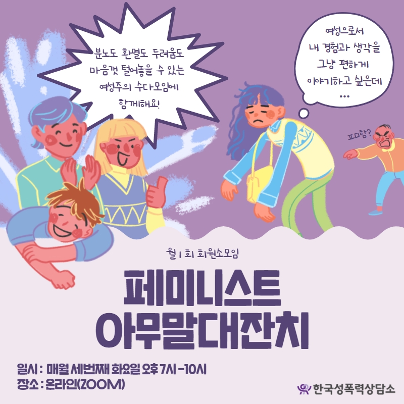 | ◆ 페미니스트 아무말대잔치에 참여하고 싶다면? 올해 "페미니스트 아무말대잔치"는 월1회 여성주의 수다모임으로 매월 셋째 주 목요일에 진행하되, 부득이한 경우에는 사전 협의하여 다른 주 목요일로 일정을 조정하는 것을 원칙으로 운영될 예정입니다. 한국성폭력상담소 회원 및 지지자는 누구나 참여 가능하오니 관심 있는 분들은 아래 내용을 참고하셔서 신청해 주세요~ ◆ 일정 : 매월 세번째 목요일 오후 7시-10시 ◆ 장소 : 신청자에게 별도 공지 *코로나19로 인해 당분간 온라인 ZOOM을 통해 진행 ◆ 문의 : 한국성폭력상담소 앎 (02-338-2890, f.culture@sisters.or.kr) ◆ 신청방법 : 다음 구글 설문지 작성 https://forms.gle/WVcNJwHW22wX2Cbw6 또는 성문화운동팀 이메일(f.culture@sisters.or.kr)로 다음과 같이 참여 신청서를 작성하여 보내주세요! 제목 : [페미말대잔치] 회원소모임 참여 신청 내용 : 이름/별칭, 연락처, 참여 동기 * 담당 활동가가 참여 신청서를 확인하면 1주일 이내로 이메일 답장을 드립니다. * 신규 참여자에게는 모임 당일에 문자로 참여 안내를 보내드립니다. * 1회 이상 모임에 함께한 참여자가 지속적으로 참여를 원하는 경우 카카오톡 오픈채팅 링크를 보내 페미말대잔치 단톡방에 초대해드립니다. 이후 단톡방을 통해 참여 안내를 받을 수 있습니다. |