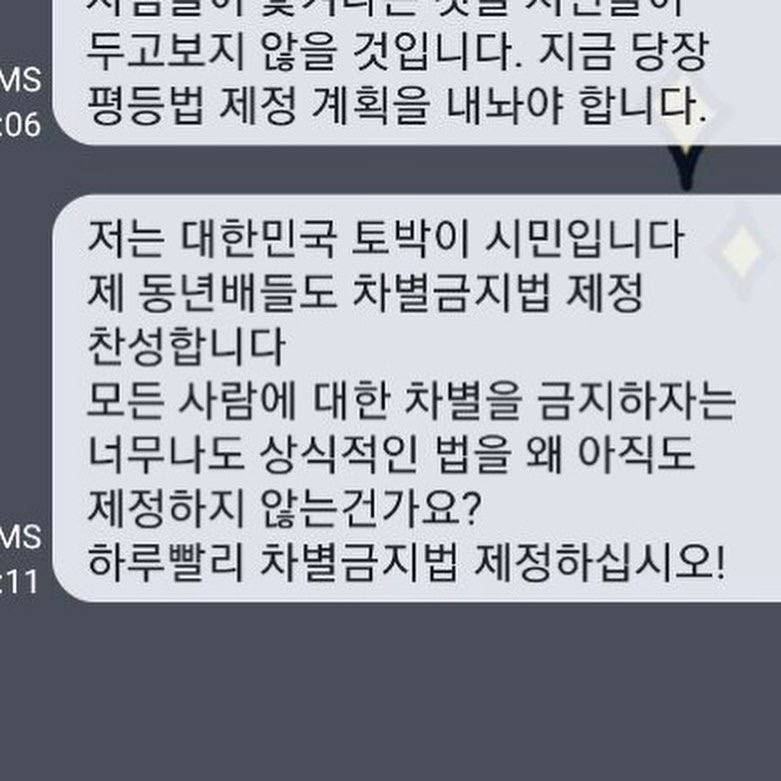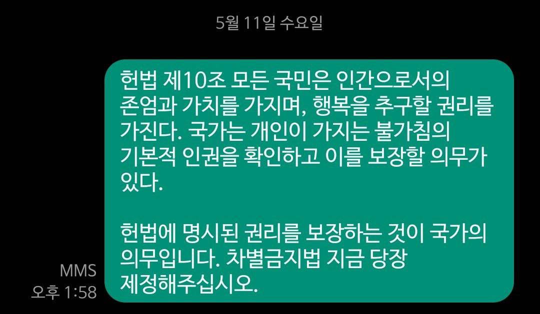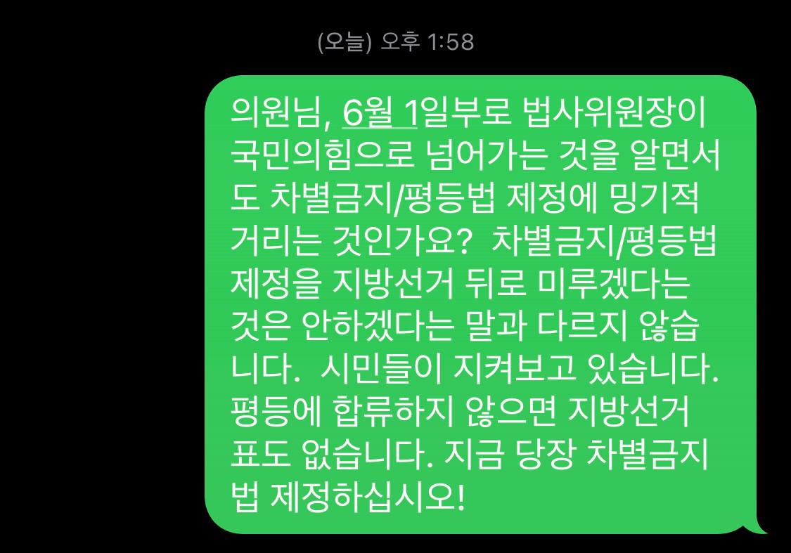 매일 국회의원들, 특히 더불어민주당 의원 및 지도부에게 차별금지법/평등법 제정을 촉구하는 문자행동을 진행하였습니다. 시기에 따라 더불어민주당 의원 전체에게 보내기도 했고, 당의 지도부 또는 법제사법위원회 의원들에게만 보내기도 했습니다. 국민을 대표해서 법을 만드는 일을 하기 위해 국회의원이 되었을텐데 차별금지법도 제정하지 않고 있으니, 핸드폰에 일하라는 국민의 메시지가 가득 울리도록 말입니다. 167석이라는 다수 의석을 가지고도 정당으로서 한국사회를 살아가는 모든 사람들이 차별과 혐오 없이 평등하게 살아갈 수 있는 기본적인 법 하나도 만들지 못한 책임은 더불어민주당에 크다고 할 것입니다. 사회적 합의가 없어서 안된다고 하더니, 대통령 지지율보다 높은 국민의 70%가 제정에 찬성한다고 하였음에도 불구하고 제정하지 않았습니다(여론조사마다 수치가 조금씩 다르지만 일관되게 다수가 찬성하고 있습니다). 사회적 요구가 국회 안까지 잘 들리지 않는다는 말에 국회 앞에서 46일간 농성을 하고 직접 문자와 전화까지 했지만 제정하지 않았습니다. 우리는 이번 봄을 지나며 국회와 더불어민주당의 책임유기를, 소수자의 인권과 여성의 인권을 나중으로 미루는 혐오/차별 정치를 똑똑히 기억할 것입니다.