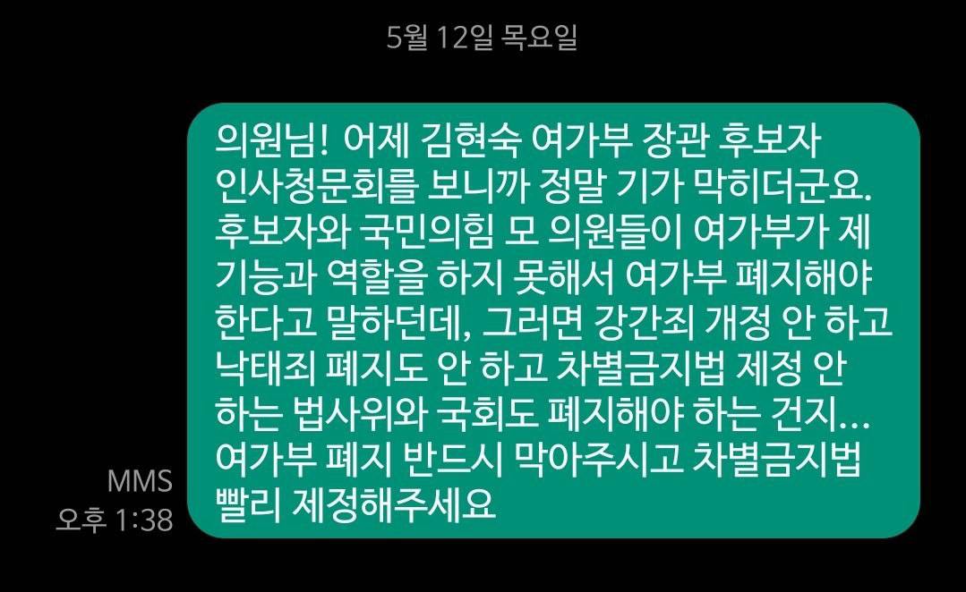 국민들의 여론은 45.5%가 여성가족부 유지개편, 18.8%가 현행유지를 바랍니다. (2022.4 넥스트리서치) 국민 여론 39.5%가 여성가족부가 성차별 문제 대응 미흡하다고 지적합니다. (2022 한국여성정책연구원), 40.1%가 가장 심각한 차별이 성별 문제라고 합니다. (2022.3 국가인권위원회 혐오차별 국민인식조사) 그럼에도 장관후보는 지난 주 국회에서 공약이니 무조건 폐지하겠다고 확언합니다.