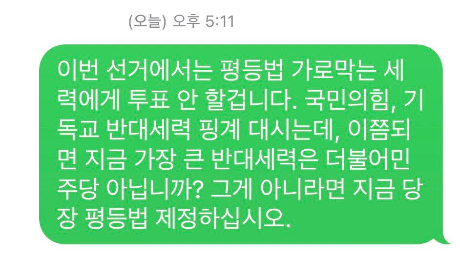 그런데 어째서 정치와 국회가, 정당이, 국회의원들이 가장 이 변화를 거부합니까? 어째서 성폭력 방지에 무력하고, 인권존중에 가장 무감하고, 차별혐오에 가장 대책없고 차별금지법을 두려워합니까?