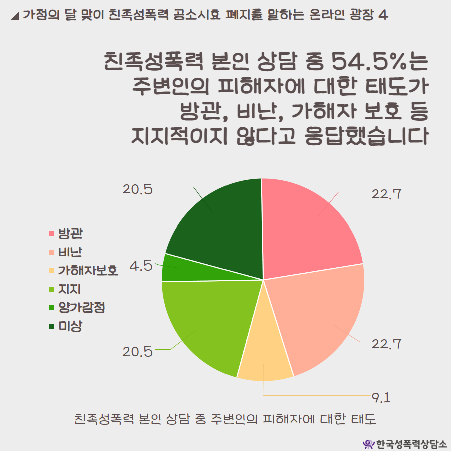 활동 현장에서는 친족성폭력뿐만 아니라 아직도 가정 내 폭력이 있다는 사실을 믿지 못하는 사람들도 만났다고 합니다. 이에 더 분발하여 활동을 지속 하겠다는 결심을 전해 주셨습니다. 가정 내 폭력이 존재한다는 것을 인정하지 않는 것은 주변의 폭력을 구별하지 못해 인지하지 못할 수도 있고 가족이란 환상을 그대로 답습하는 상황이 아닐까 하는 생각이 들었습니다.