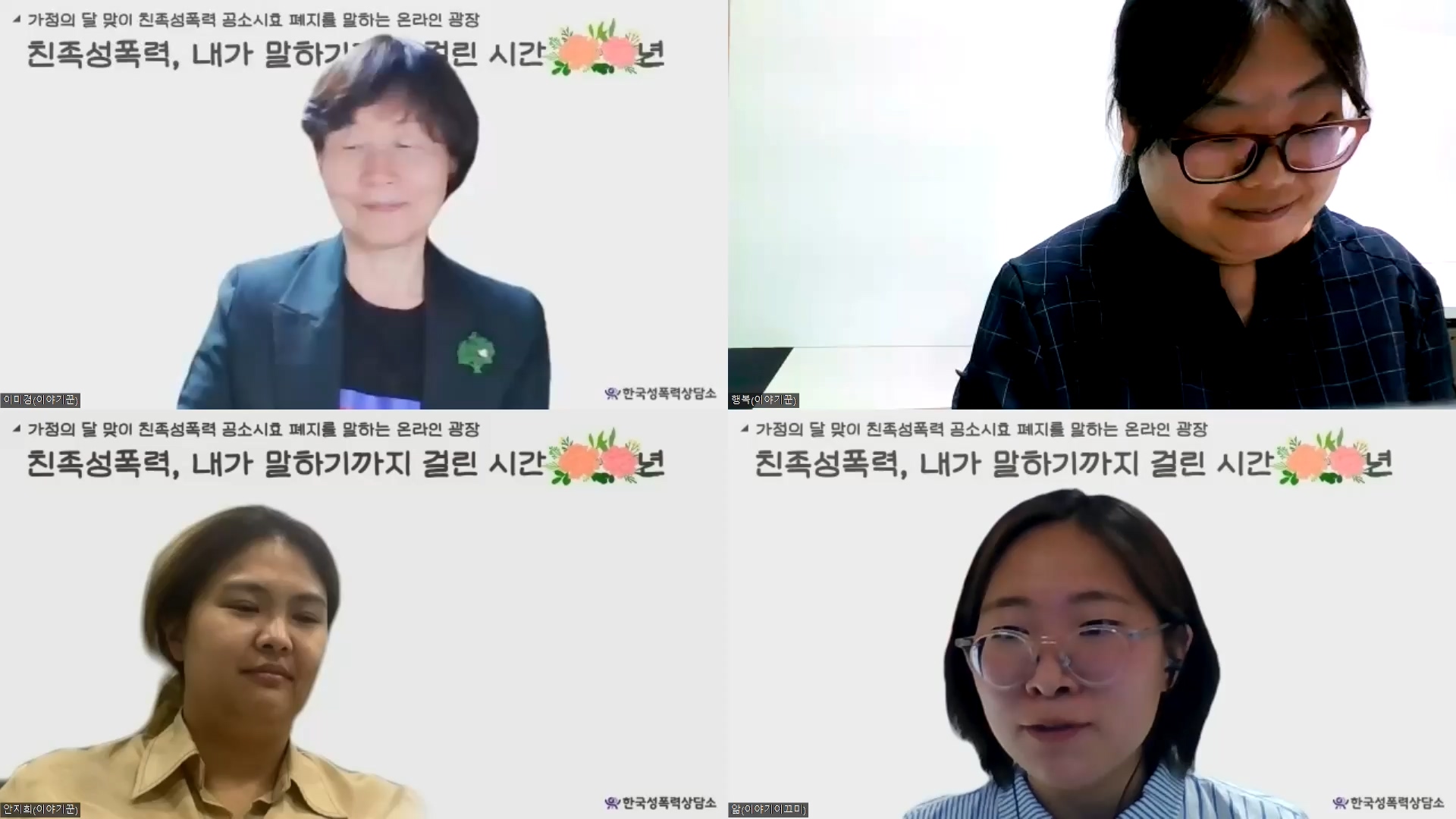 1부 <국가는 "공소시효가 끝났다"고 말한다>에서는 이야기꾼 이미경(한국성폭력상담소 이사), 안지희(법무법인 위민 변호사), 행복(서울강서양천여성의전화 활동가), 그리고 이야기이끄미 리을 미음 받침의(^^) 앎(한국성폭력상담소 활동가)의 진행으로 이야기 광장이 펼쳐졌습니다.