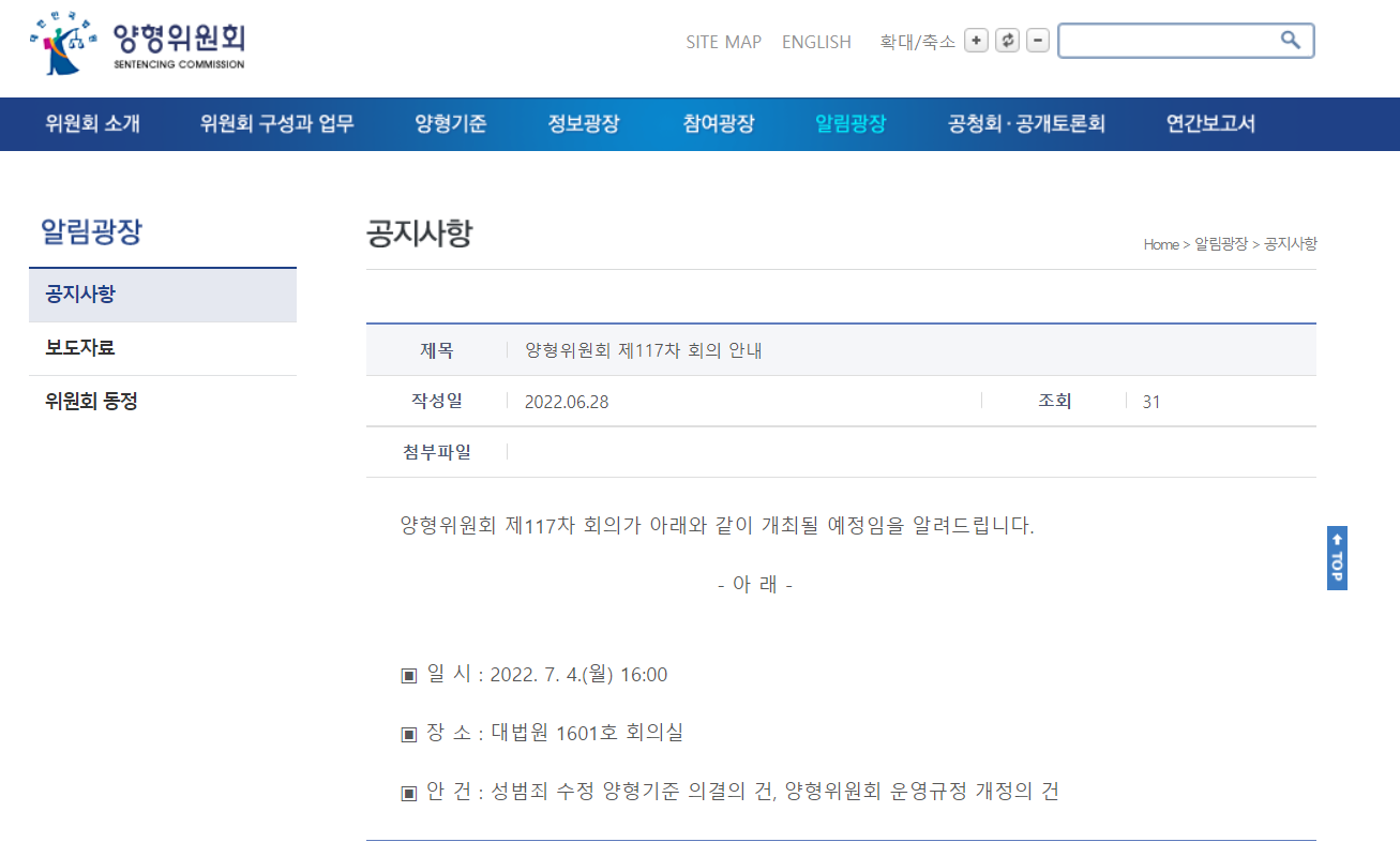 전국 여러 의견이 양형위원회에 제출되었을 것입니다. 양형위원회는 성범죄 수정 양형기준에 대해서 7월 4일 117차 회의에서 의결 예정이라고 공지했는데요, 초안 의결 버전을 재차 똑같이 의결하기 보다, 보다 제대로 된 변화를 위한 의견을 수렴하여 최종 개정을 의결하면 좋겠습니다. 결과를 지켜봅시다!