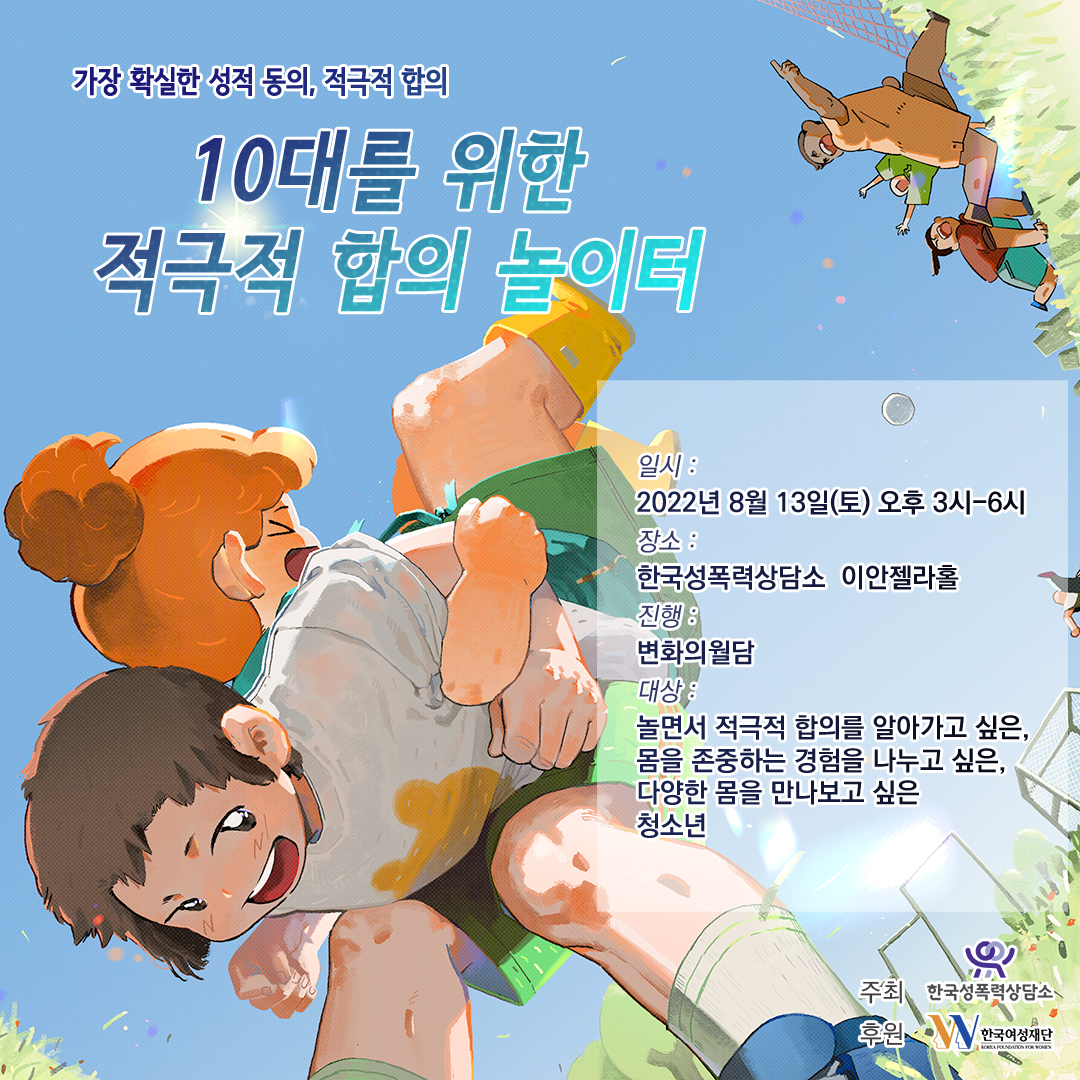 가장 확실한 성적 동의, 적극적 합의 맞춤형 워크숍은 9월 3일 <친밀한 관계를 위한 적극적 합의 건강 검진(신청 클릭)>, 9월 17일 <남성을 위한 적극적 합의 보드게임 카페(신청 클릭)>, 9월 24일 <성폭력 생존자를 위한 적극적 합의 자기방어훈련장(곧 홍보 예정)>까지 계속 이어질 예정입니다. 많은 관심과 참여 바랍니다!