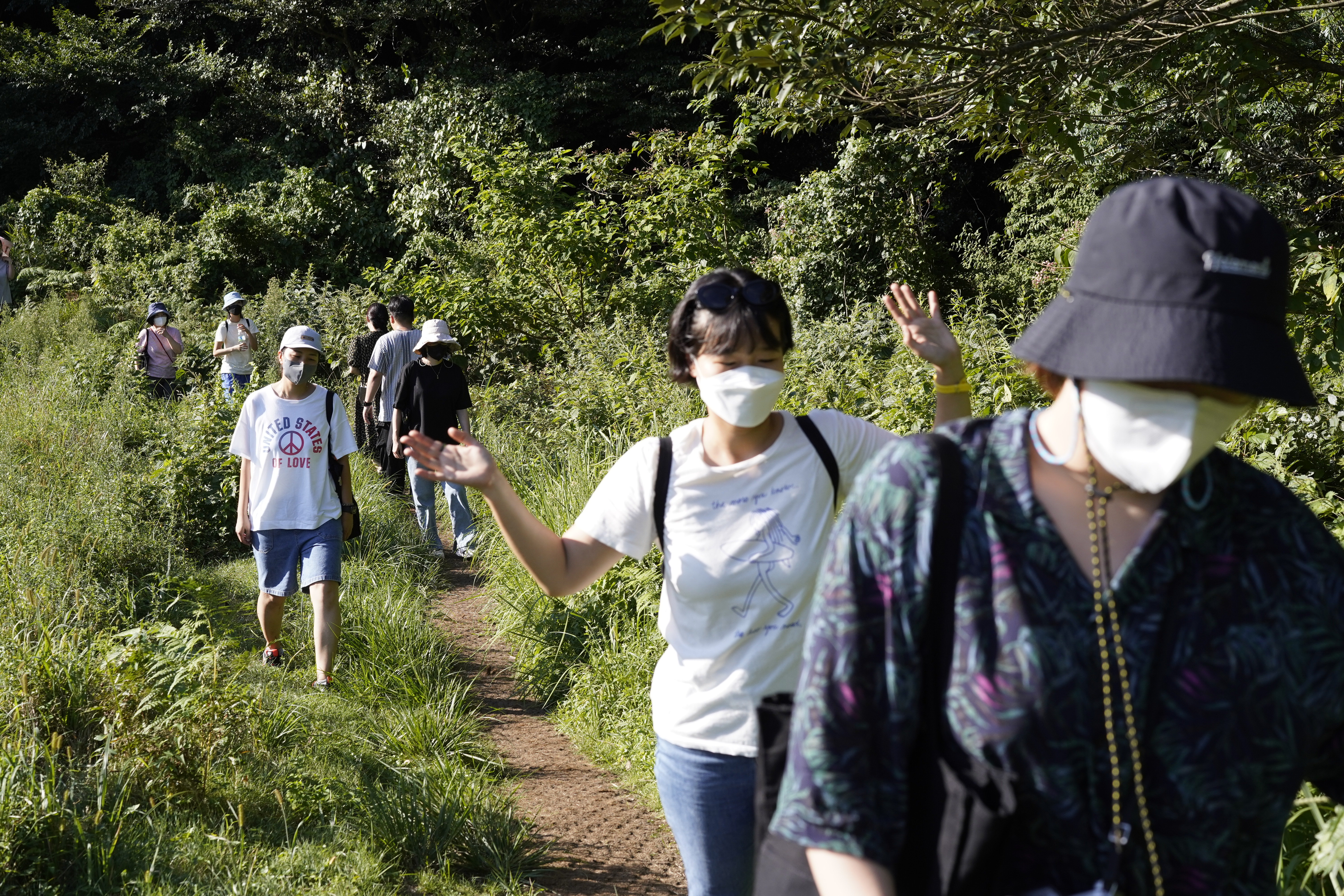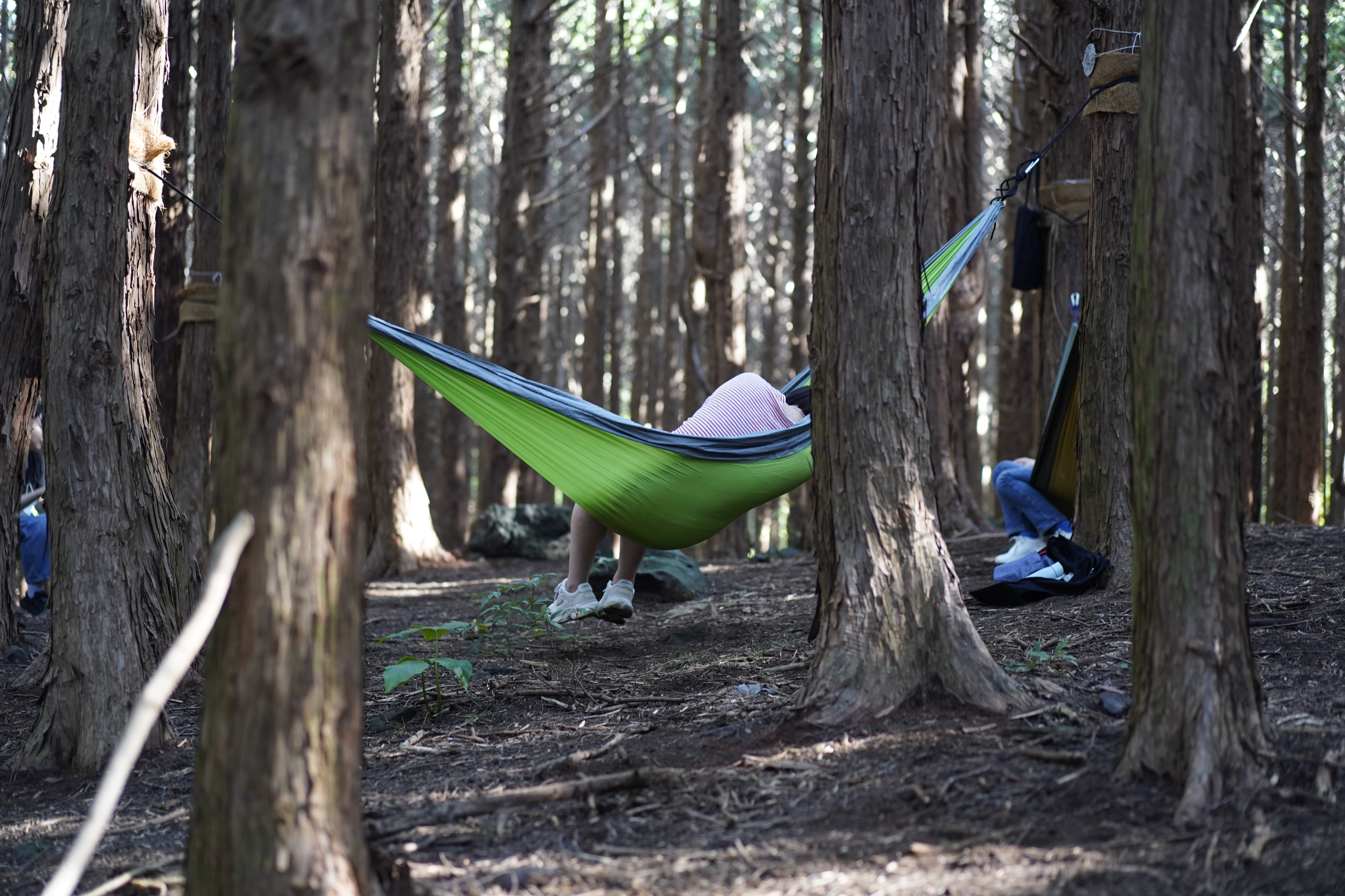 삼나무, 동백나무를 비롯해 다양한 수종의 나무가 이룬 숲을 지나 곧 편백숲에 다다랐습니다. 하늘로 높이 뻗은 편백나무 사이에 해먹을 걸고 잠시 누워 명상을 했어요. 바람에 나뭇잎이 스치는 소리와 새의 지저귐에 집중하며, 오랜만에 머리를 비우고 제 마음을 들여다볼 수 있었습니다. 그러다 깜빡 잠이 들기도 했고요. 태생이 저질체력이라 땀을 뻘뻘 흘리며 걸었지만, 숲의 공기를 마시는 것만으로도 절로 힐링이 되었습니다. 사실 저는 워크숍 일주일쯤 전에 발목을 접질려 반깁스를 하고 있었는데요, 발목의 피로가 무색할만큼 편안한 시간이었습니다(하지만 여러분은 이러시면 안돼요^_ㅠ). 다음에 다시 제주를 찾으면 또 오고 싶을 정도였답니다.