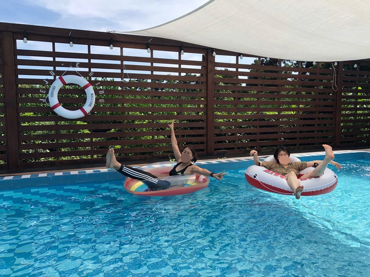 숙소에 돌아와, 감이와 저는 수영장에서 따뜻한 햇살을 만끽했습니다. 튜브에 누워 둥실둥실 떠다니는 기분이 참 새로웠어요. 전날 편백나무 숲 속에서 기분좋은 해먹의 흔들림에 몸을 맡겼을 때와는 또 달랐습니다.