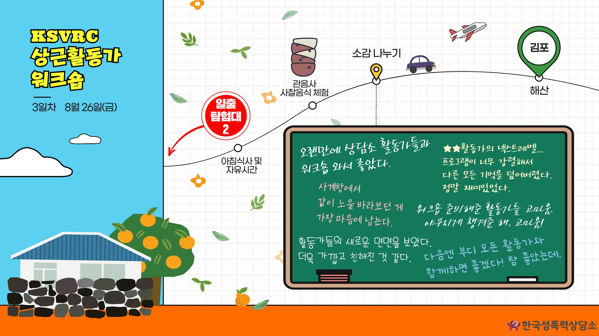 지난 8월 24일, 상담소 활동가들은 설레는 마음을 안고 비행기를 탔습니다. 코로나19로 인해 무기한 연기되었던 상근활동가 워크숍을 드디어 가게 되었거든요. 그것도 제주도로요! 유쾌한 웃음과 편안함이 가득했던 그 시간을 전해드릴게요:)