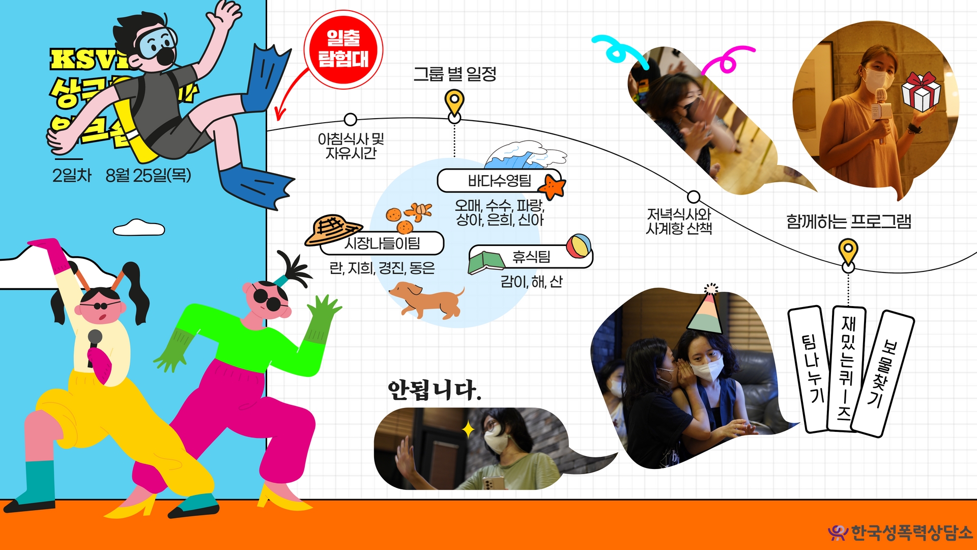 해가 저물고 숙소로 돌아오니, 감상에 빠져 아련하던 눈을 번쩍! 뜨이게 할 레크리에이션 프로그램이 준비되어 있었습니다. 프로그램을 기획한 상담소의 예능작가 란, 감이, 신아 활동가가 사실 아침부터 물밑작업(?)을 하고 있었는데요. 그것은 바로 팀 나누기! 아침 식사로 두 가지 종류의 주스 중 같은 주스를 고른 사람끼리 팀을 나누려 했다고 해요. 네, ‘했다고 해요’. 한라봉주스의 압승으로 팀 나누기가 제대로 되지 않았거든요… 늦잠을 자느라 아침을 거른 활동가도 있고요…