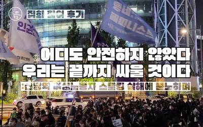 최근 법원에서 정책 의제화될 조짐을 보이는 스토킹 범죄에 대한 처벌을 강화하는 움직임을 보이고 있다고 해서 반갑긴 하지만, 젠더 폭력의 본질을 흐리고 범죄 행위 일반으로 꼬리자르려는 현 정부에서 과연 우리는 얼마나 생존할 수 있을까요. 집회 당시 참가자의 모든 끈을 모아서 하나로 이은 것처럼, 사회적 죽음에 연결성을 느끼고 함께 애도하며, 현 정권의 암담한 현실에도 포기하지 않을 것입니다. 당초 300명으로 예상되었던 참가 인원이 행진 시작 직전 500명을 돌파하였다고 합니다. 우리의 마음처럼 일터의 성평등의식에 대한 당위성에 직장문화가 응답할 때입니다.