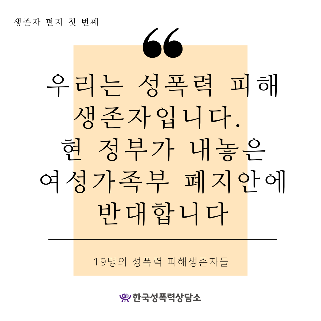 성폭력 피해 생존자로서의 삶에는 단순히 ‘힘들게 살았다’라는 말로 설명할 수 없는 수많은 어려움이 있었습니다. 피해를 의심받고, 공격 받기도 하고, 공동체에서 배척당하기도 하고, 피해를 회복하고 일상을 되찾기 위한 과정도 지난했습니다. 세상 모두가 가해자편에 있는 듯 했습니다. 여성폭력이 여전히 존재하는 한 언제고 우리와 같은 고통을 또 다른 누군가는 겪을 수 있습니다. 그럴 때 피해자가 안전하게 일상으로 돌아갈 수 있도록, 우리를 지지하고 지원하는 곳이 계속 남아있어야 합니다. 앞으로 살아갈 수많은 생존자를 위해, 앞으로 발생할지도 모를 피해자를 위해 여성가족부는 존재해야 합니다.