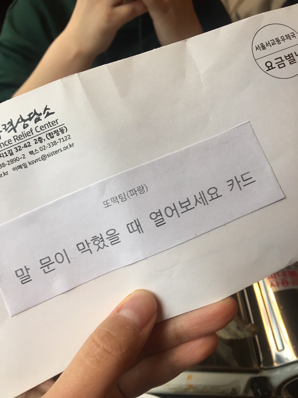 점심시간 조편성은 한국성폭력상담소 활동가 2명, 한국여성의전화 활동가 2-3명으로 이루어졌습니다. 각 기관에 처음 보는 활동가들끼리 점심식사 자리에서 침묵이 흐를까봐 걱정된 기획팀은 아래와 같은 귀여운 장치까지 마련했습니다. 참으로 다정한 장치라고 생각했으나 ‘본래 진실로 알고 있었으나 거짓이었던 것은?’ 이라는 키워드가 나오자 말문이 오히려 막히고 한국성폭력상담소 활동가들은 왜 이러냐라는 조롱을 받았다는 소문.. 하지만 저희 팀에서는 해당 카드를 요긴하게 사용하여 대화를 나누었답니다. 함께 활동한지 1년여만에 내 동료가 일본어를 잘한다는 사실, 컴퓨터공학과라는 사실도 알게되었답니다!