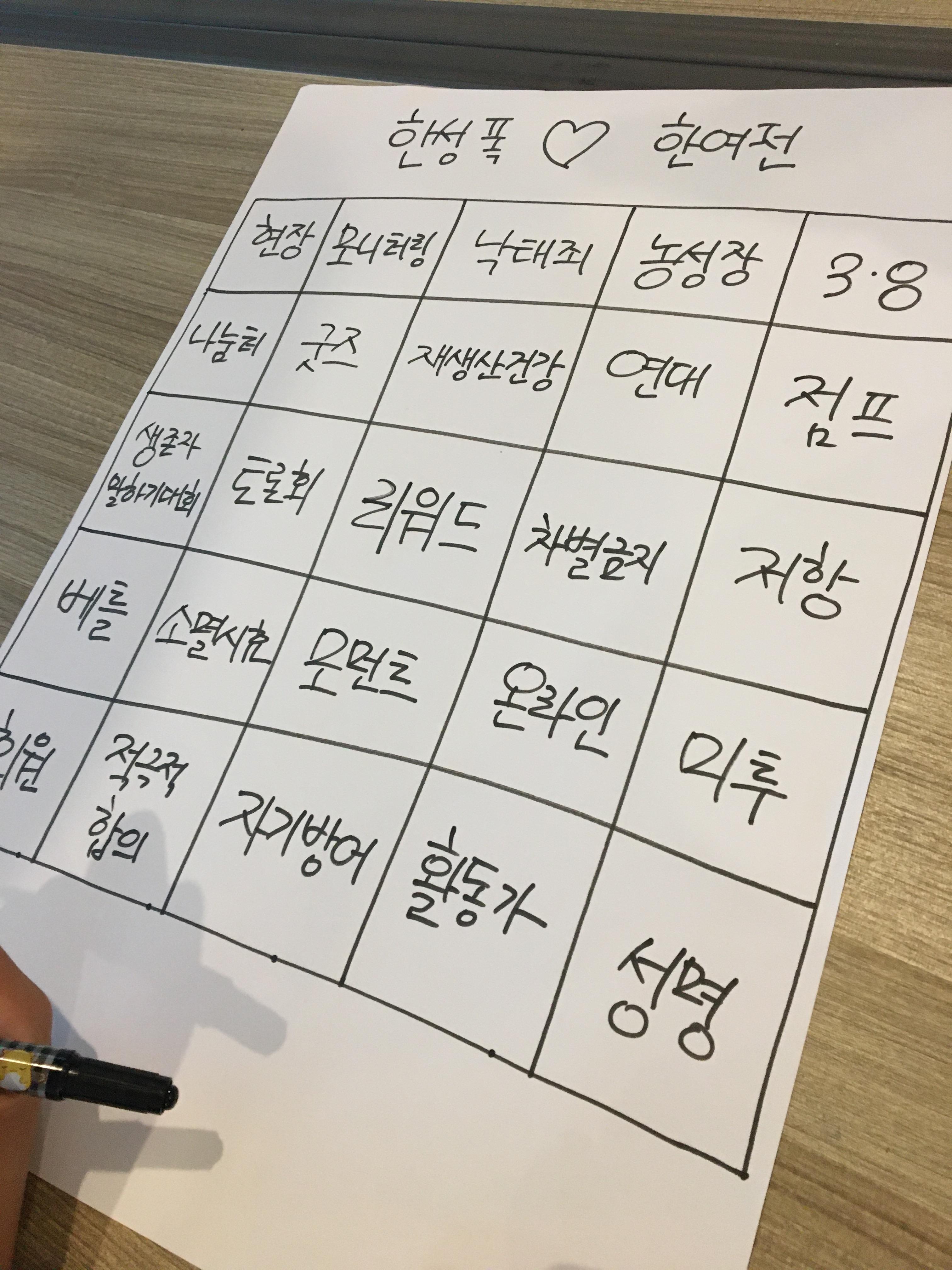 한 조에 두 기관의 활동가들이 섞여있으니 신기한 현상도 발견되었는데요. 한국여성의전화 활동가들은 무조건 일어나고 리액션이 큰 반면 한국성폭력상담소 활동가들은 앉아있고 웃기에 바빴다는.. 두 단체의 극명한 외향성과 내향성이 돋보이는 구성이었습니다.