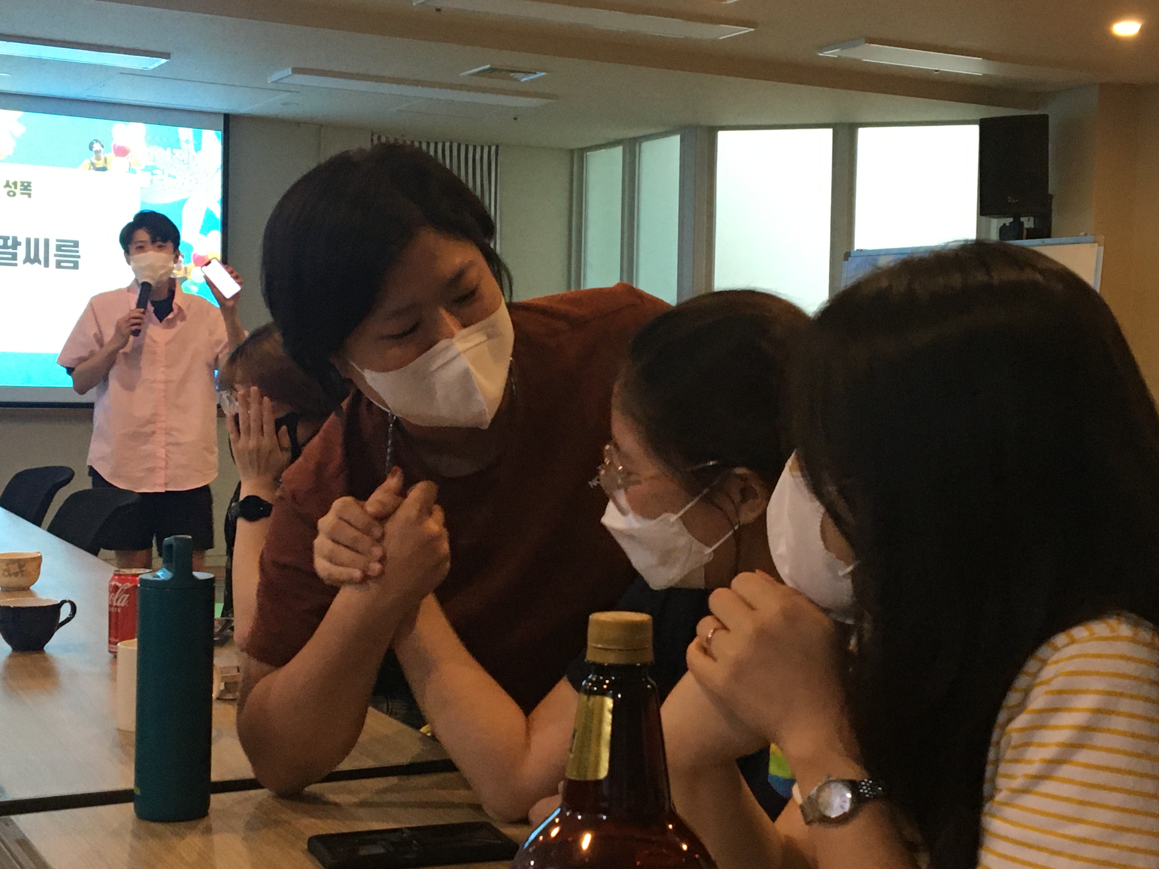 독박골에 있는 한국여성의 전화에 택시타고 방문 -> 왠지 모르지만 기선제압을 준비함 -> 하지만 어림도 없었음 -> 오자마자 직접 만든 소중한 점심을 먹으면서 ‘산넘어 산’ 게임으로 활동가 전원 이름 맞추기 게임을 함 -> 이것은 게임 대잔치 시작에 불과했다.. 이후 4시간동안 이어진 게임의 향연(팔씨름, 근력대결, 노래맞추기, 키워드로 발언문 완성하기, 소식지 단어 빙고 등등) -> 모든 것을 불태우고 양쪽 동점이라는 결과에 만족하면서 뒤풀이