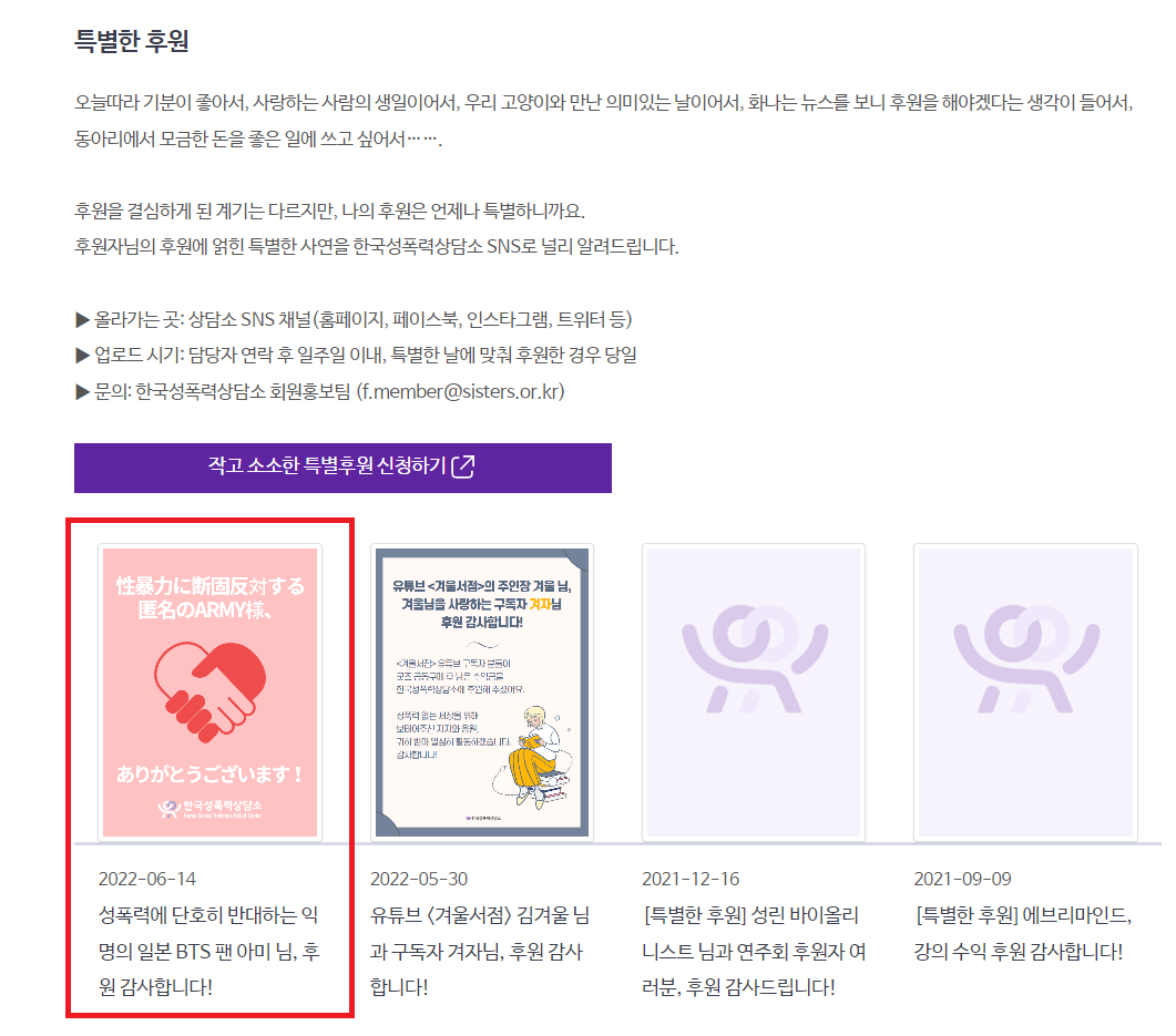 앨범 보이콧에 참여한 A님은 앨범 가격만큼의 금액을 상담소에 후원해 주셨어요. 그리고는 주변에 본 이슈와 관련하여 한국의 여성단체에 후원하고 싶어하는 아미가 많다며, 상담소와 확인하는 과정을 거쳐 개인 SNS 계정에 후원 경험에 대한 글을 올렸습니다. A님의 다정함과 사려깊음이 묻어나는 글이었는데, 몇 개월이 지난 지금도 잊혀지지 않는 문구가 있어요.