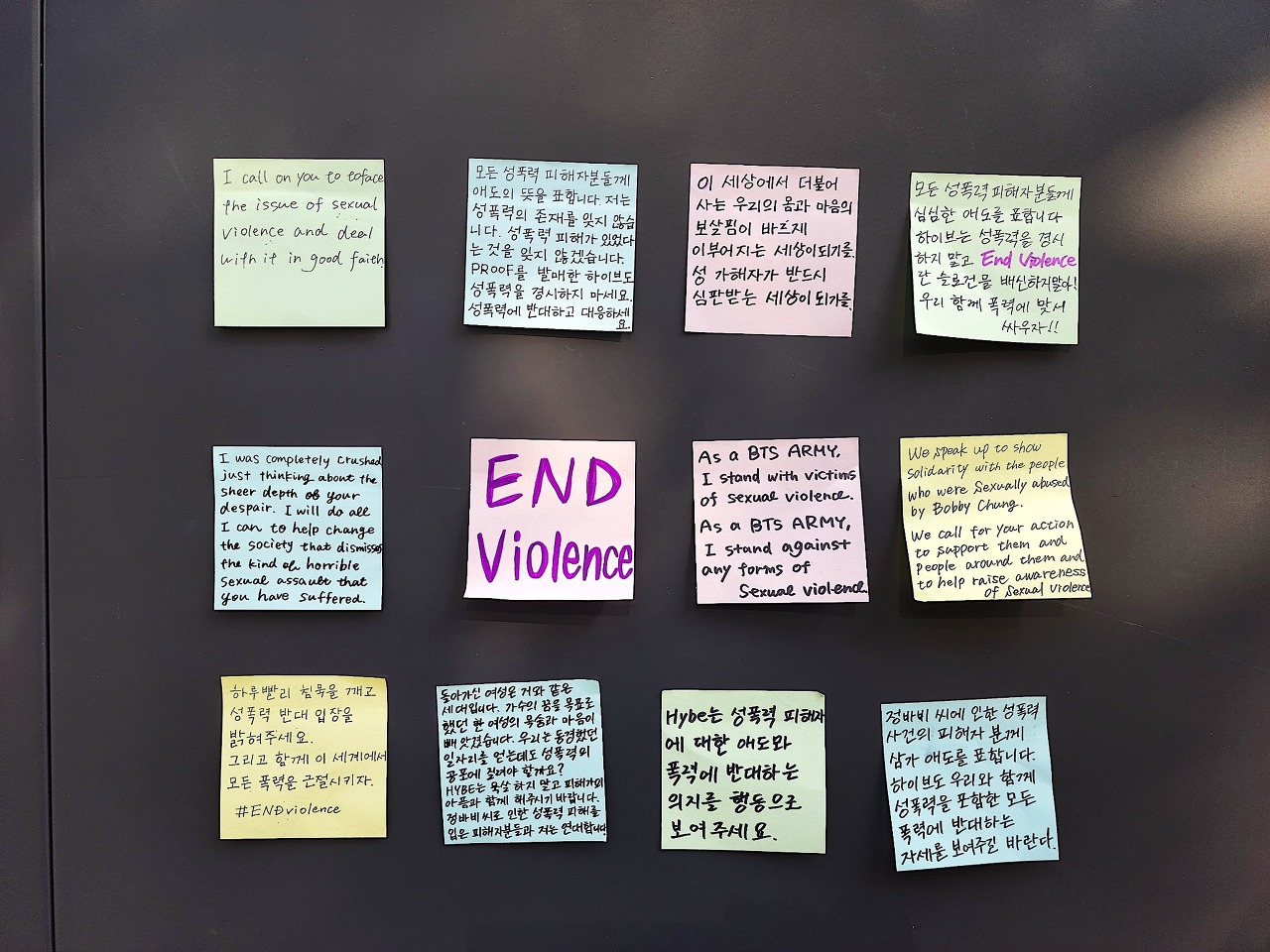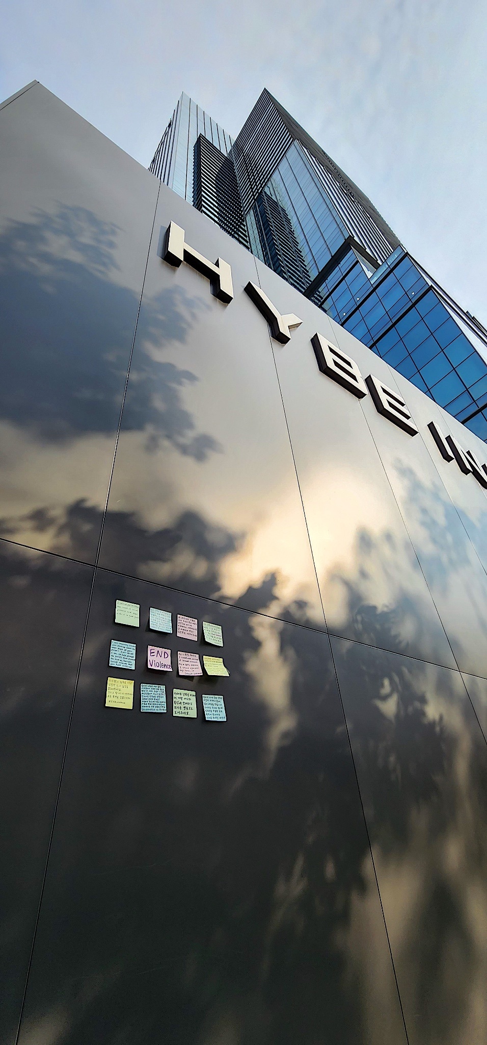 며칠 후, A님이 BTS가 소속된 HYBE 사옥에 포스트잇을 붙인 사진을 보내주었습니다. 작곡가 이슈에 대한 입장 표명을 촉구하는 내용이었고, 일본어 뿐 아니라, 한국어와 영어로도 적혀있었습니다. 검은 건물 벽에 붙은 색색의 포스트잇이 눈에 띄었어요.