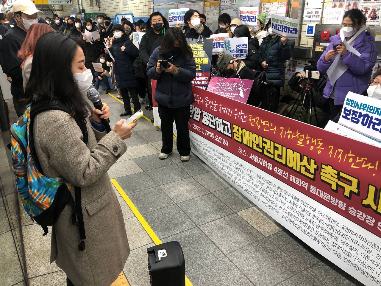 이에 2023년 1월 19일 목요일 오전 9시, 혜화역 5-3 승강장에서 전장연에 대한 탄압 중단과 장애인권리예산 촉구하는 시민사회 지지 기자회견이 진행되었습니다. 이날 기자회견은 한국성폭력상담소를 포함하여 102개의 단체가 공동주최하였습니다.