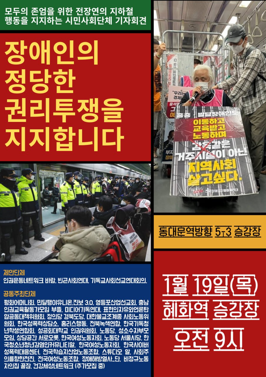 우리 인권시민사회단체는 장애인도 시민이기에 장애인권리예산이 보장되어야 하는 데에 동의하며, 이를 위한 전장연의 지하철시위와 관련해 다음과 같이 요구한다.