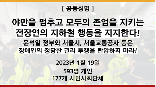 하나, 우리는 한국 사회의 야만을 멈추기 위해 모두의 존엄을 지키는 전장연의 지하철행동을 지지한다!