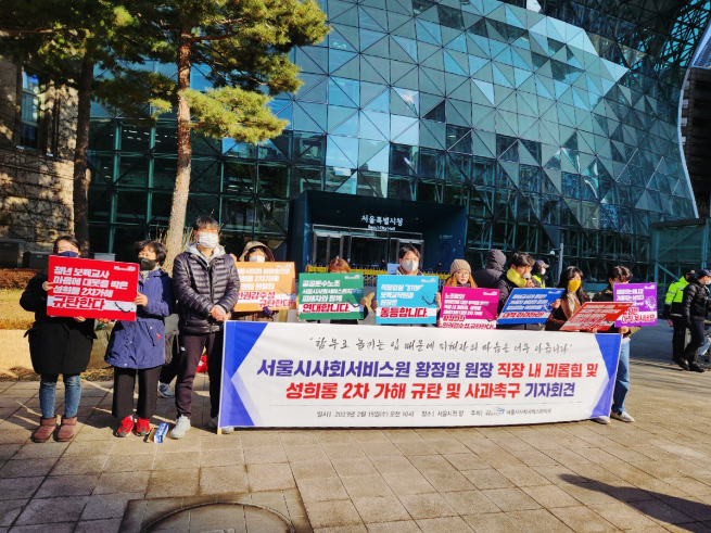 2023년 2월 15일, 서울시청 앞에서 공공운수노조 서울시사회서비스원지부의 기자회견이 열렸습니다. 서울시 산하의 공공기관(투자출현기관)인 서울사회서비스원에서 일어난 직장내성희롱과 괴롭힘에 대해서 서울시 "시민인권침해구제위원회"가 기관과 기관장장(황정일)의 2차 피해를 인정했기 때문입니다. (관련기사 보기 Click)