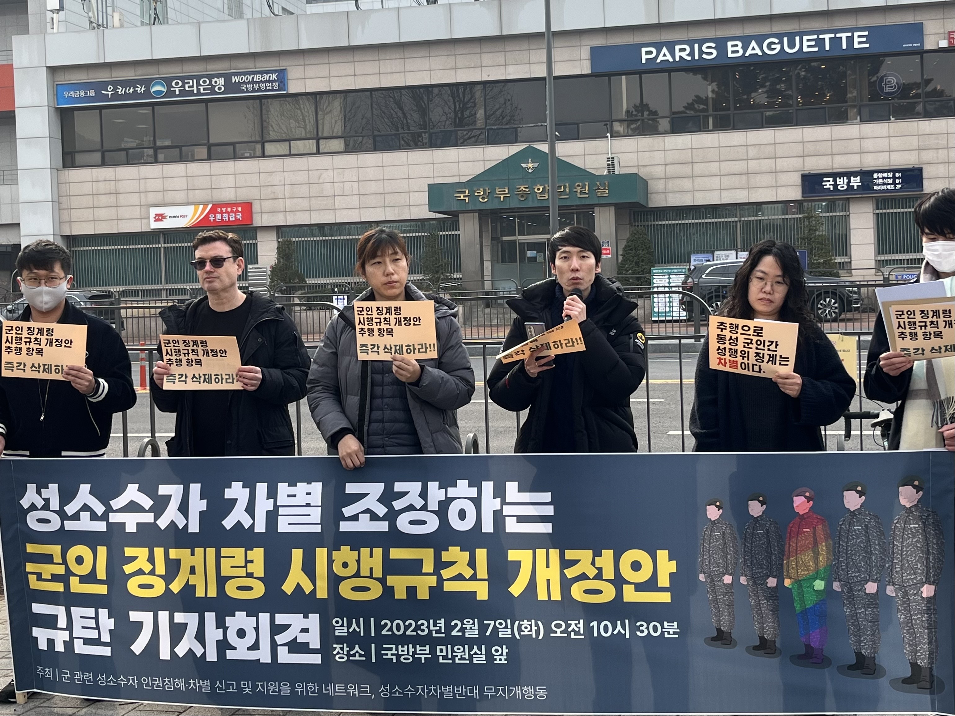 지난 2월 7일 화요일 국방부 앞에서 <성소수자 차별 조장하는 군인 징계령 시행규칙 개정안 규탄> 기자회견이 있었습니다. 군 관련 성소수자 인권침해 차별 신고 및 지원을 위한 네트워크(이하 군성넷)와 성소수자차별반대 무지개행동(이하 무지개행동)이 공동주최한 이 기자회견에 한국성폭력상담소는 군성넷 소속단위로서 기자회견 함께했습니다.