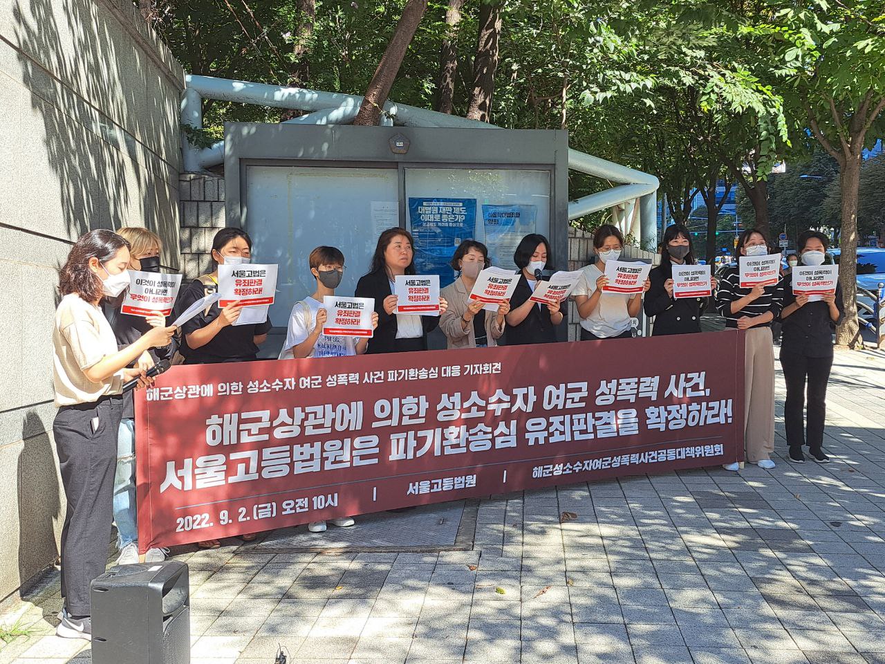 가해자B에 대한 첫 파기환송심은 지난 2022년 9월 2일(금)에 열렸습니다. 이에 공대위는 "해군상관에 의한 성소수자여군 성폭력사건, 서울고등법원은 파기환송심 유죄판결을 확정하라!"라며 서울고등법원의 유죄판결 촉구 기자회견을 개최하였습니다.