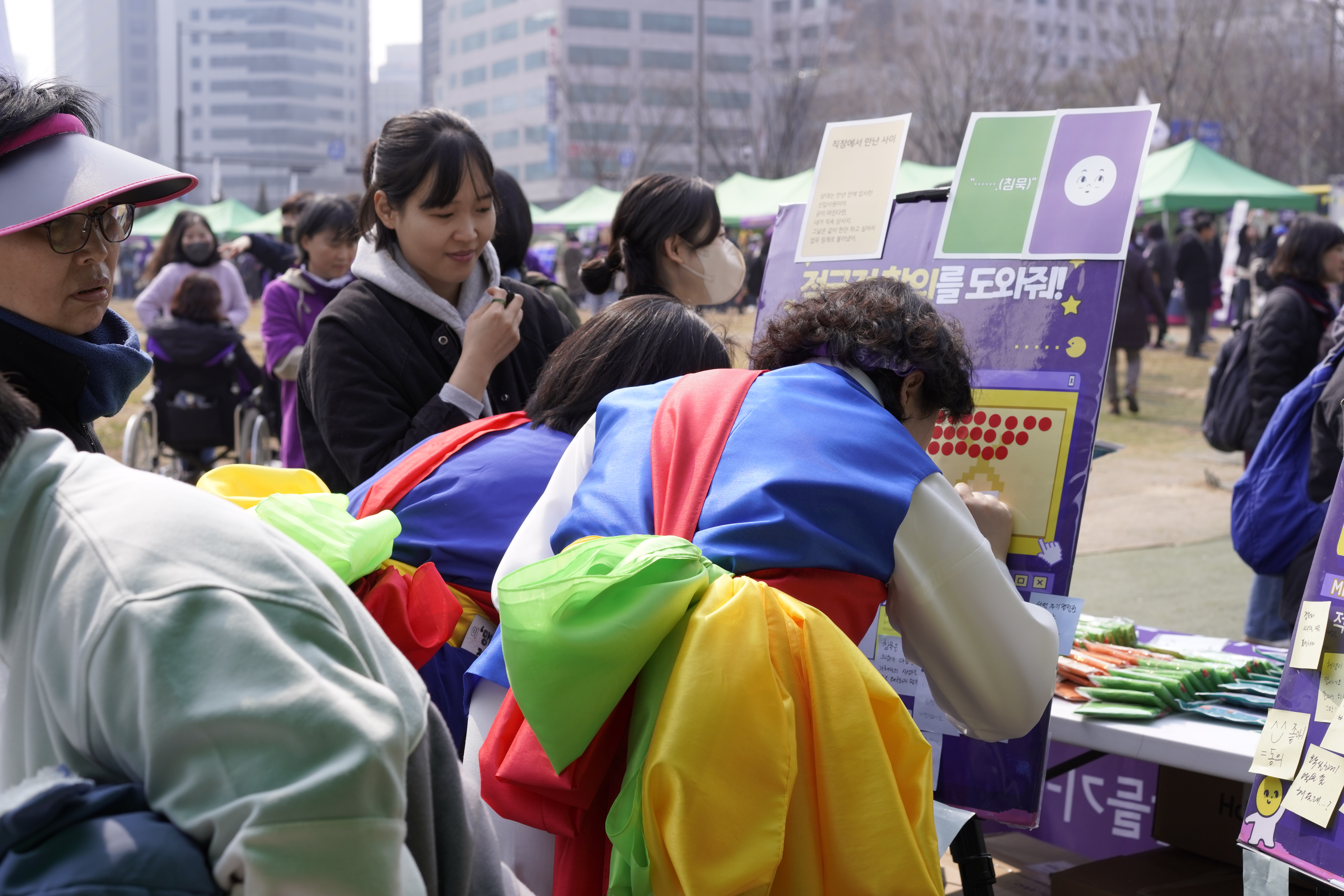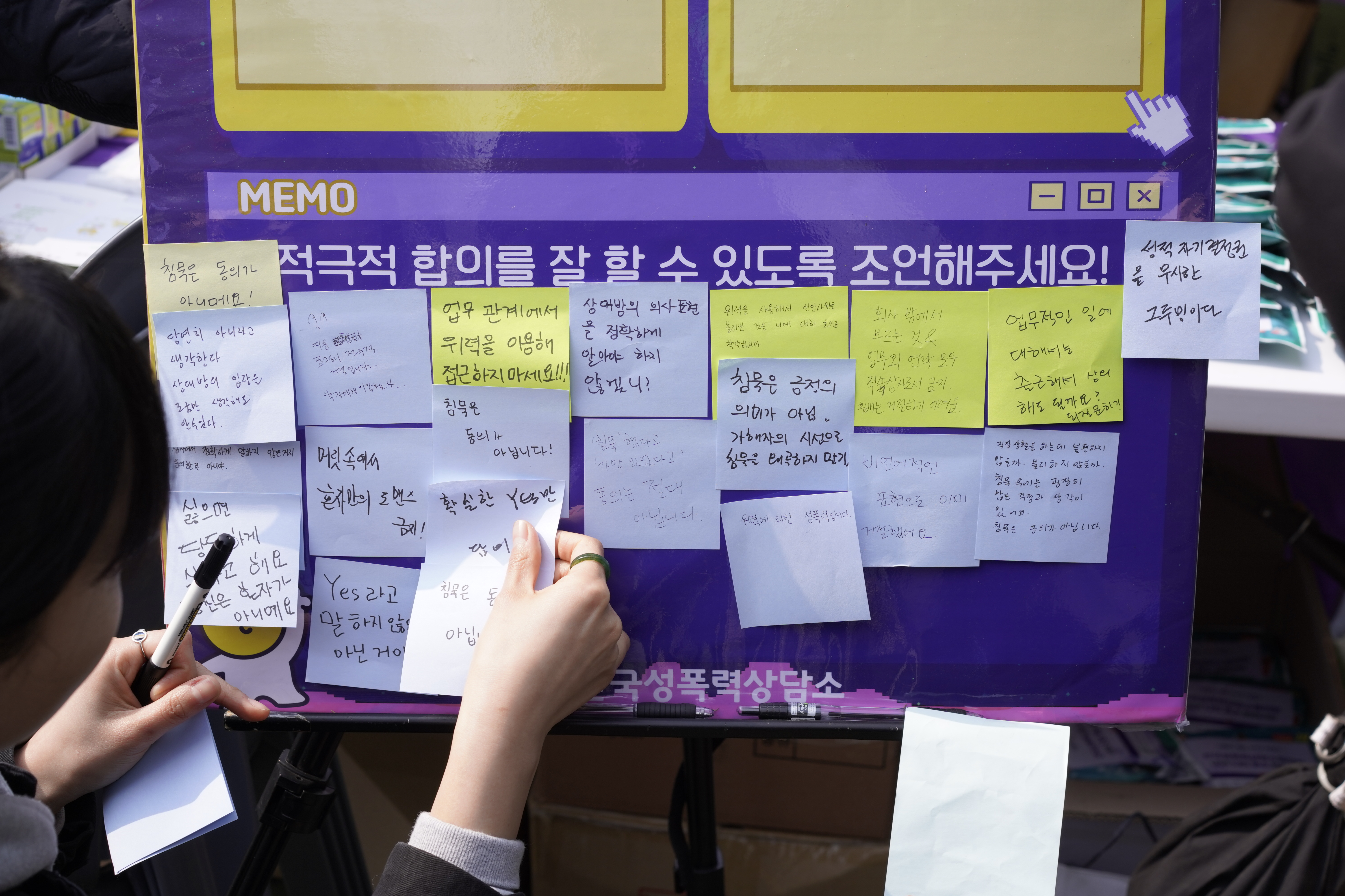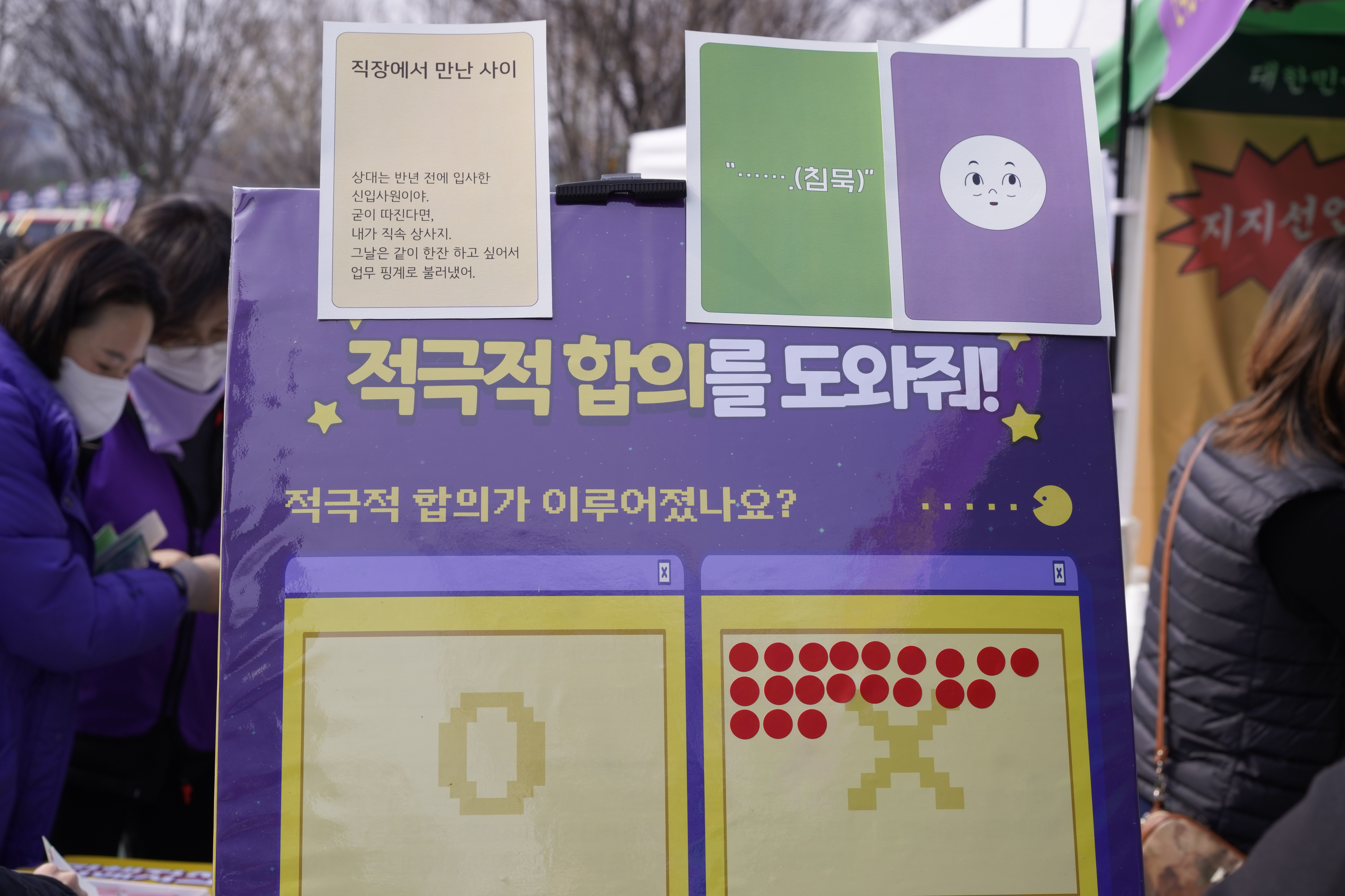 동의가 단순히 상대에게 예스라는 말을 받아내는 것이 아니라 두 사람간의 관계, 당시 상황, 말과 표정을 종합적으로 고려해야 한다는 것을 게임을 통해 드러내고자 만들어진 프로그램이었는데요. 부스 참여자들의 조언 속에는 이런 기획취지를 꿰뚫어 보는 촌철살인의 말들이 쏟아져 나왔습니다. 다들 고민많은 친구에게 때로는 호된 말로 적극적 합의가 될 수 없는 이유를 알려주면서도, 성심성의껏 진심을 담아 조언하는 모습들이 저는 가장 인상적이었습니다. 우리는 각자 적극적 합의가 없는, 그래서 폭력이거나, 폭력으로 발전될 수 있는 상황에 대해 판관이기보다는 적극적으로 개입할 수 있는 주변인이자 조력자인 경우가 대부분인데 이때 우리는 무슨 이야기를 할 수 있을까 풍부한 사례가 쌓일 수 있는 자리였습니다.