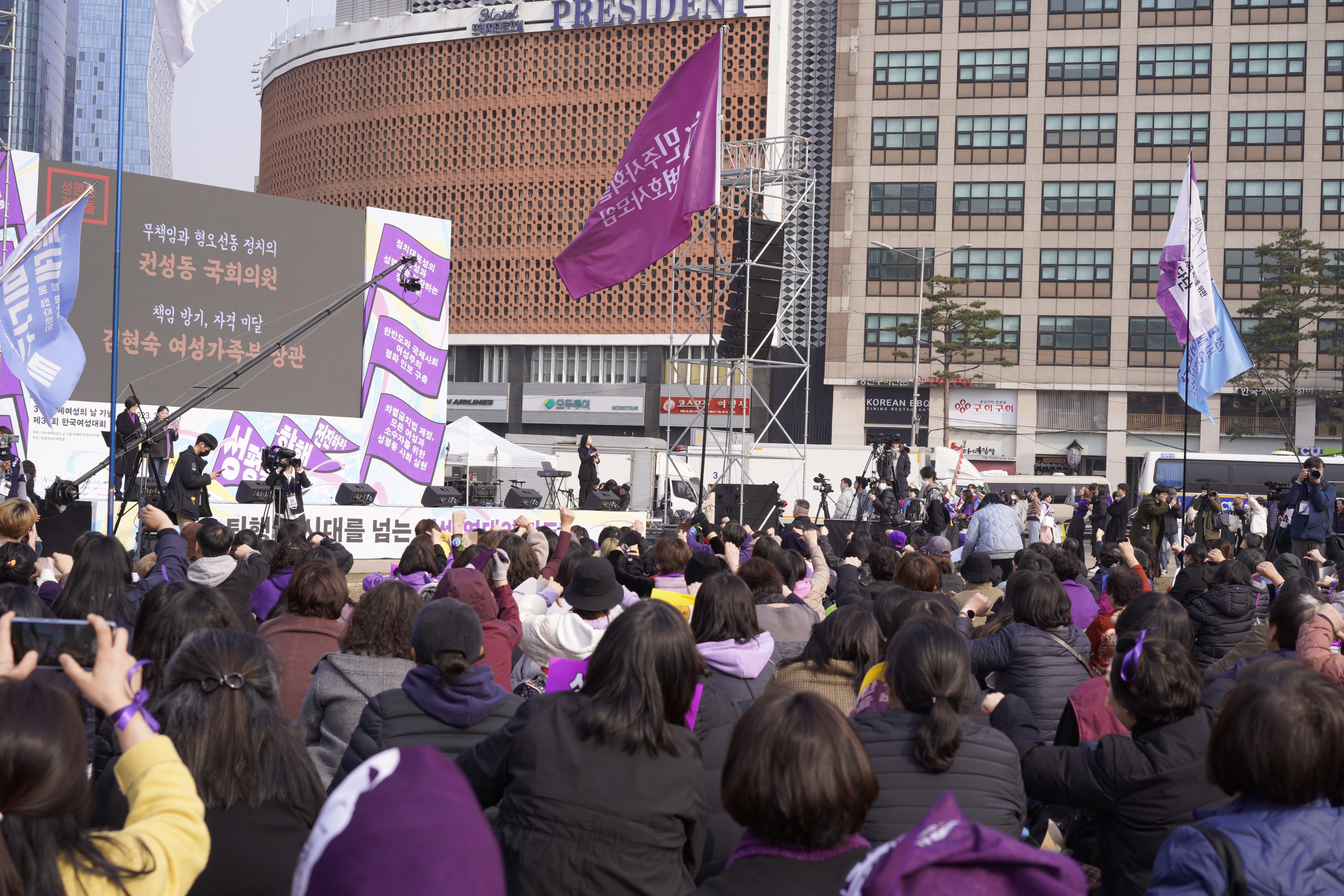 올해 여성대회의 슬로건은 "성평등을 향해 전진하라! 퇴행의 시대를 넘는 거센 연대의 파도" 였습니다. 오랜만에 오프라인으로, 그것도 탁트인 서울과장에 모이니 환대가 넘실넘실 대는 축제의 현장이었습니다!