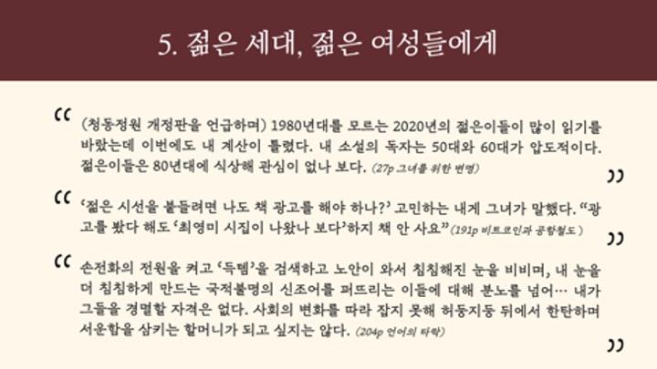 최영미 시인은 끝까지 싸워 승소하였는데요, 끝까지 싸울 수 있었던 원동력에 대해 시인은 다음 세대의 여성들을 생각했기 때문이라 말씀하셨습니다. 자신이 끝까지 싸워서, 결국 이겨냈음을 여성들에게, 사람들에게 알려야 한다고 생각하셨다고 합니다. 미투 이후 한 공동체에서 오히려 미투 당사자가, 피해자가 더 외면 받는 우리 사회에서 시인님이 끝까지 싸우며 절대 굴하지 않았던 모습에서 많은 힘을 얻고 저항에 대한 동력을 얻을 수 있었습니다.