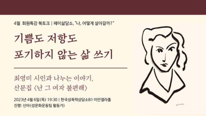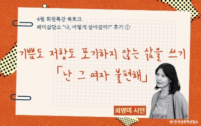 회원특강 북토크 페미삶담소 “나, 어떻게 살아갈까”의 첫번째 시간인 최영미 시인과의 북토크에서는 페미니스트로 살아가며 저항과 기쁨을 모두 잃지 않으려 했던 최영미 시인의 이야기를 들으며, ‘나는 어떻게 살아갈 것인가’에 대한 답에 조금씩 다가갈 수 있었습니다. 한 여성의 삶에 대해 읽고 이야기 나누며 공감도 하고 위로도 받을 수 있었던 시간이었던 최영미 시인의 <난 그 여자 불편해>의 북토크 현장으로 초대합니다.